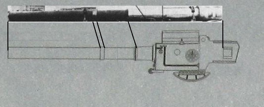 Wenn ich nun das Foto von Schatton noch einmal betrachte fällt mir auf, das die Länge unterschiedlich ist. Die Durchmesser des Rohres scheinen aber gleich zu sein. Auf Originalfotos sieht das ganz anders aus. Vorn ein langer Teil, dann der Stützring ( etwas dicker ) es folgt ein Teil was in etwa dem vorderen Teil entspricht. Etwa da wo das Rohr aus der Wiege schaut ( und wo das vordere Seil eingehängt wird ) wird es wieder dicker ( wie der Stützring ) und am Ende wieder einige Ringe und Teilstücke ( zur Befestigung des Bodenstückes ?) noch dicker.