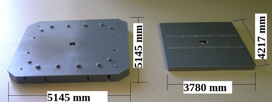 Die Platten sind jeweils aus einem Stück. Auf der vorderen größeren Platte sind einige Nippel zu sehen. ich vermute das es die Erdnägel darstellen soll. Die Originalmaße habe ich mal daneben geschrieben. Ob diese Originalmaße stimmen kann ich nicht sagen, es fehlen mir da Angaben. Wenn man aber die bekannten Fotos auswertet könnte es bei der vorderen Platte passen. Bei der hinteren Platte auf keinen Fall die Breite.