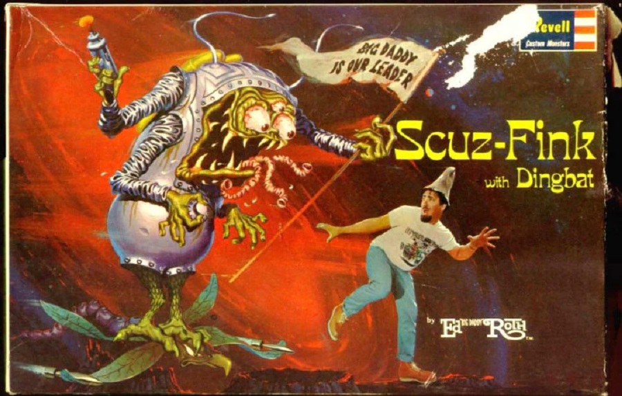 Nun ja dann wollen wir mal. Es geht um die ( Micky Maus ) von "Ed "Big Daddy" Roth namens Rat Fink . Nur hier die fliegende Version "Scuz-Fink" auf dem Dingbat. Revell hat einige dieser Figuren im Programm gehabt. Ich habe einige Zeit in USA gearbeitet und ein Modellbauhändler meines Vertrauens ( in Greensboro ) hat diese Figuren gesammelt und in seinem Laden ausgestellt. Ich hatte mir zwar nie eine Figur gekauft, fand sie aber schon immer interessant.