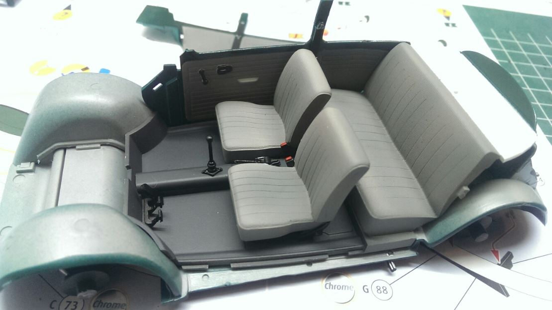 Weiterhin unterzog ich die Sitze / Gurte einer Korrektur. Wie beim Polizeikäfer angemerkt wurde, passen die Gurtschlösser nicht zum Modell an den Sitzen. Das wurde beim Käfer nie gemacht. Die Gurtpeitschen (so heißen sie wirklich) sind am Mitteltunnel festgeschraubt. Also Die Schlösser an den Sitzen entfernt und neue Peitschen an den Mitteltunnel angebaut.