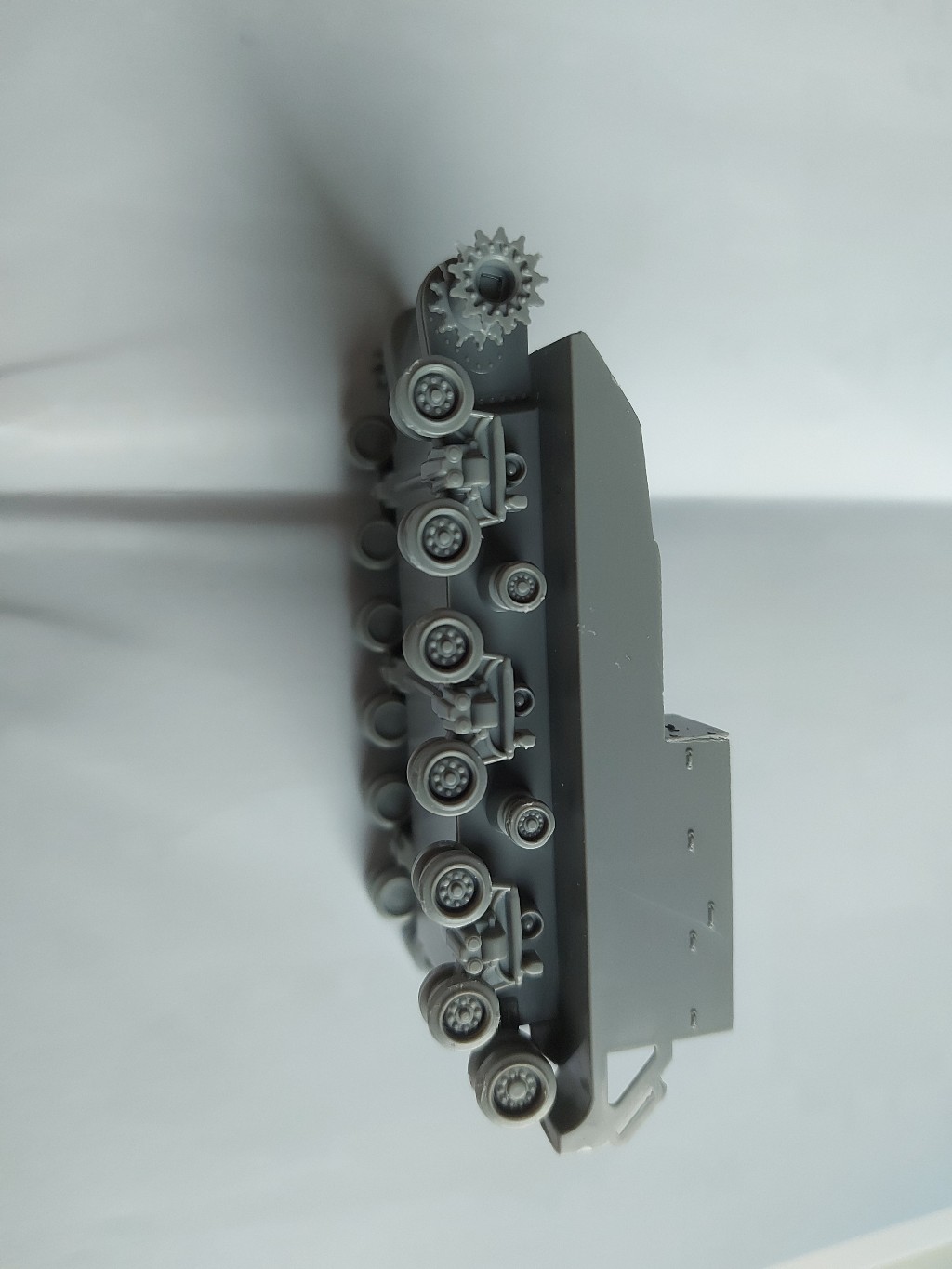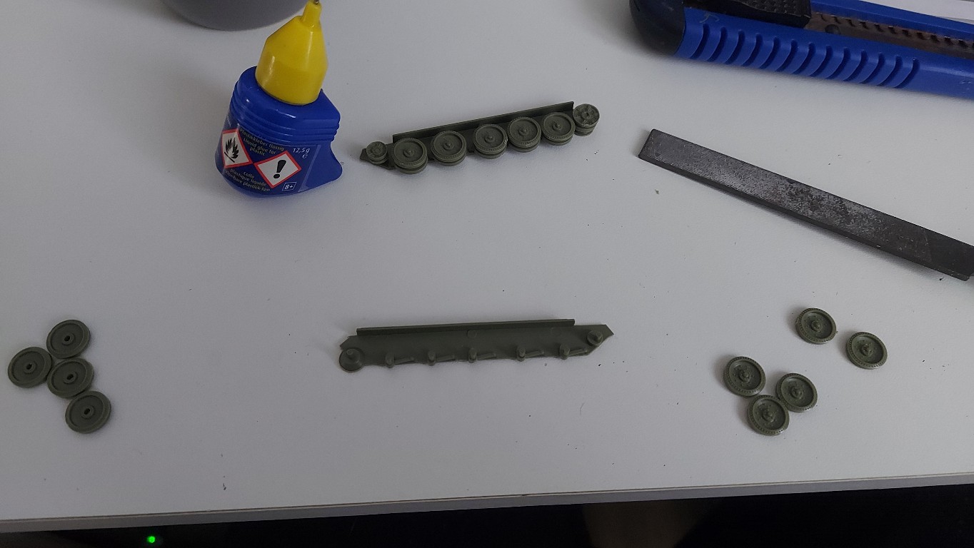 Anschließend folgten die sechs Laufrollen. Diese sind dem späten Sherman "easy eight" sehr gut nachempfunden.
