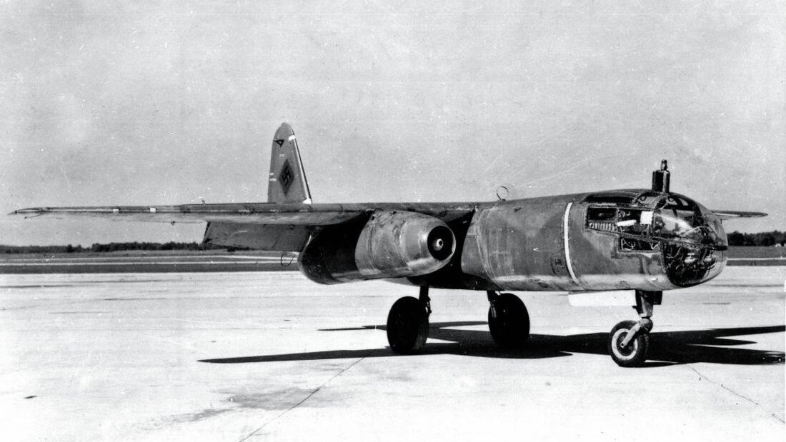 Die Arado Ar 234 (Suggestivname: Blitz) der deutschen Luftwaffe war gegen Ende des Zweiten Weltkrieges der erste einsatzfähige – und tatsächlich eingesetzte strahlgetriebene Bomber der Welt. Im März 1944 fand der Erstflug der verbesserten B-Version statt, die ersten Einsätze als Aufklärungsflugzeug folgten im Juni 1944. Die Bomberversion Ar 234 B-2 wurde ab Anfang 1945 eingesetzt, wobei die Bomben extern mitgeführt wurden. Das setzte die Geschwindigkeit allerdings so weit herab (auf ca. 660 km/h), dass schnelle kolbenmotorgetriebene Jagdflugzeuge der Alliierten die Arado bekämpfen konnten. Auch wenn in den Endtagen des Krieges dem Bomber eine eher bescheidene Rolle zukam, da er wegen des allgemeinen deutschen Treibstoffmangels die meiste Zeit am Boden blieb, zeigte sich doch in den wenigen Einsätzen, dass es für die alliierten Jäger nahezu unmöglich war, ihn abzufangen.