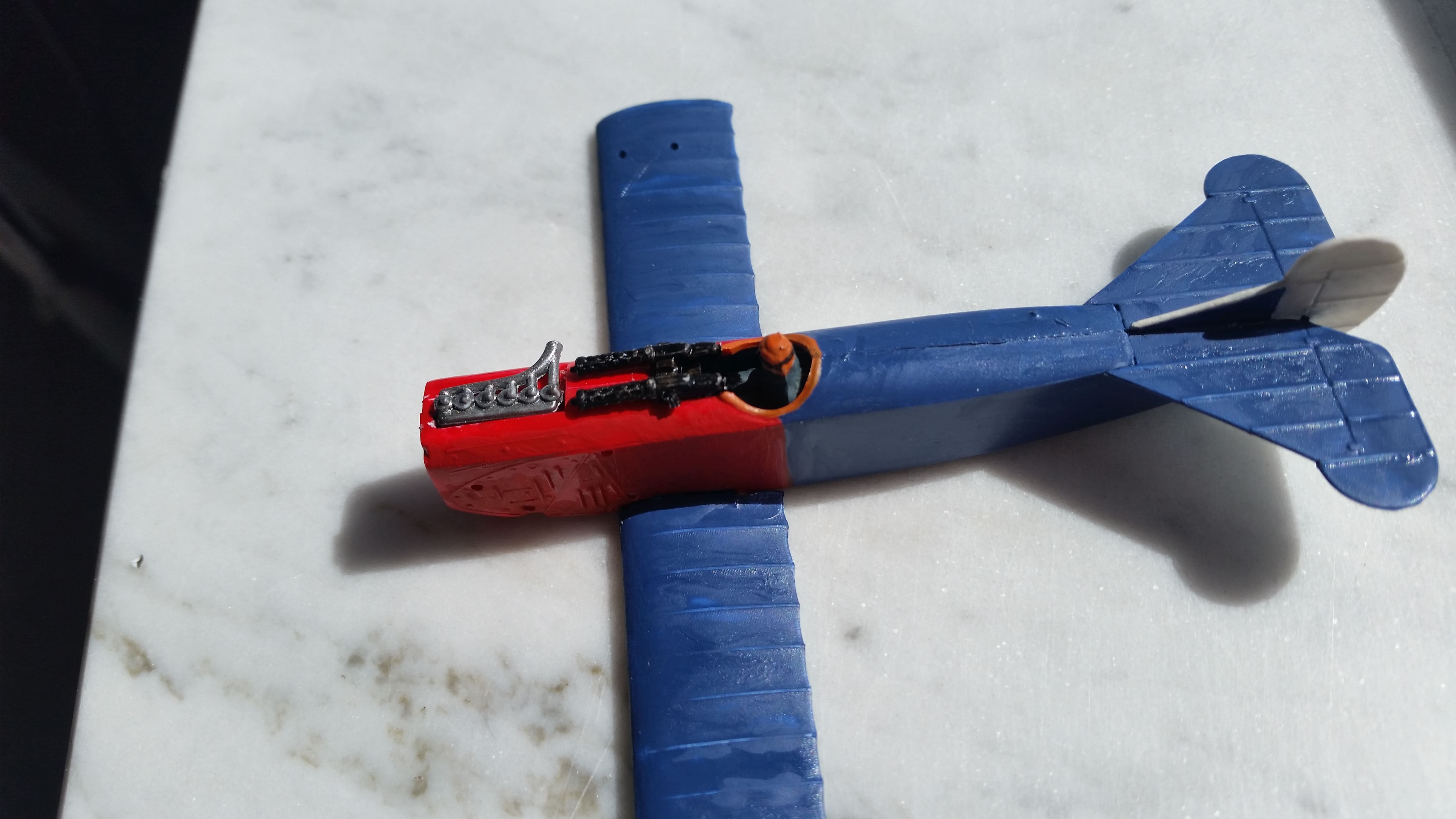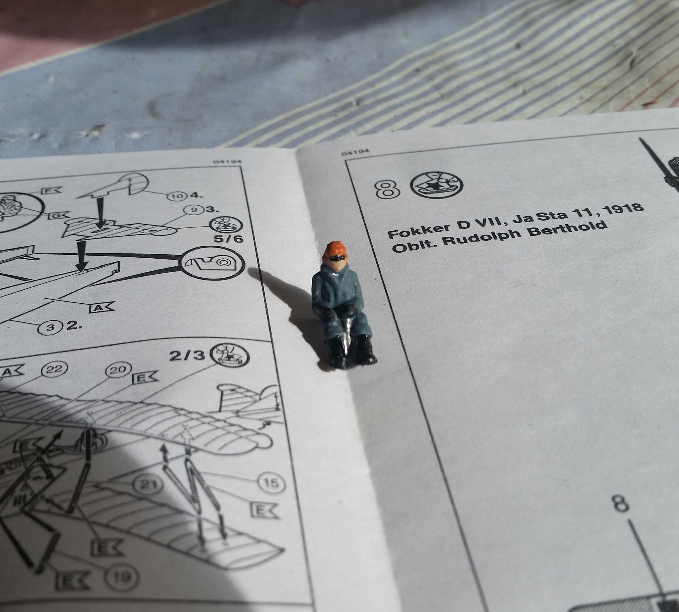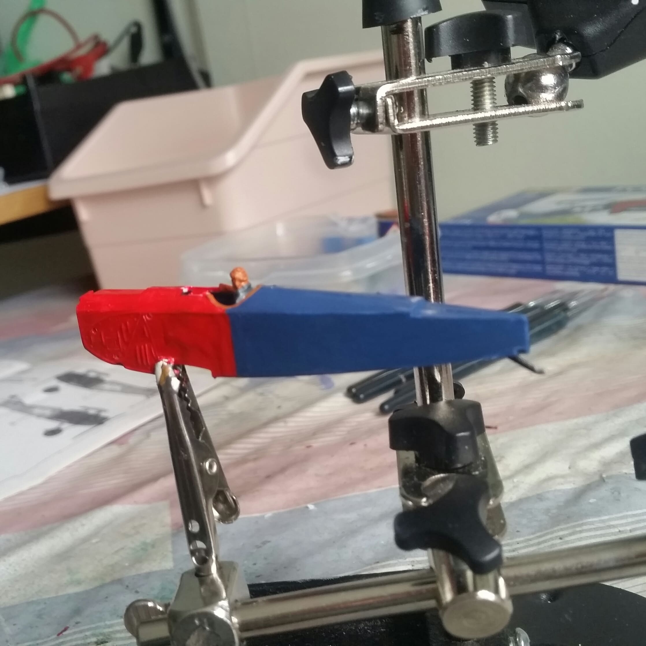 Der Rumpf ist zusammen, angemalt, und der Pilot sitzt. Aber die Probleme kommen unterhalb der Tragflächen mit dem Giraffenmuster auf den Decals. Wird nicht so einfach wie der Bausatz vermuten lässt.
