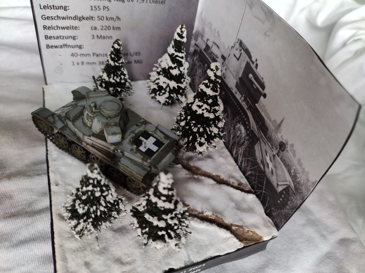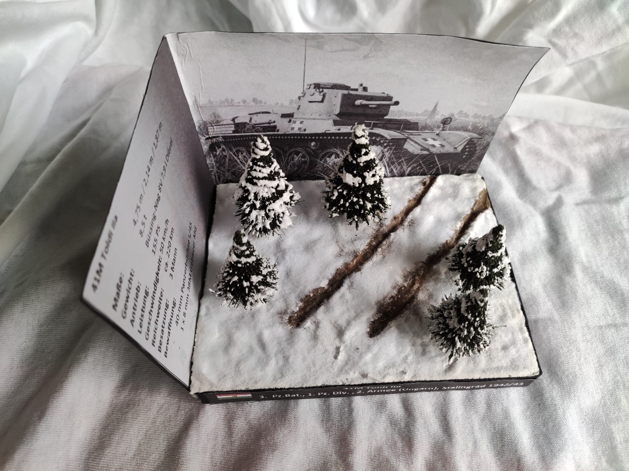 Das Diorama bildet eine kleine Styrodurplatte. Hier wurden die "Klobürsten" Wintertannen eingeklebt, wobei man sagen muss das die in dem Maßstab noch überzeugen. Anschließend kam eine Schicht Gips und Schneepulver auf die Platte. Mit verdünnter Erdfarbe habe ich dqann die Fahrspuren nach gemacht.