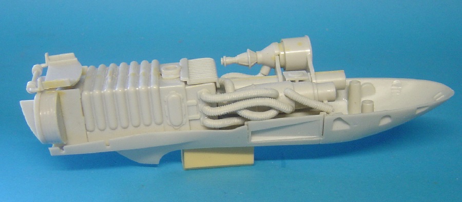 1. Am Motor habe ich die obere Platte mit den Nockenwellenabdeckungen verkehrt herum eingeklebt. Ich musste deshalb die vier Löcher für die Kühlwasserrohre auf der gegenüberliegenden Seite neu bohren und die richtigen verspachteln.