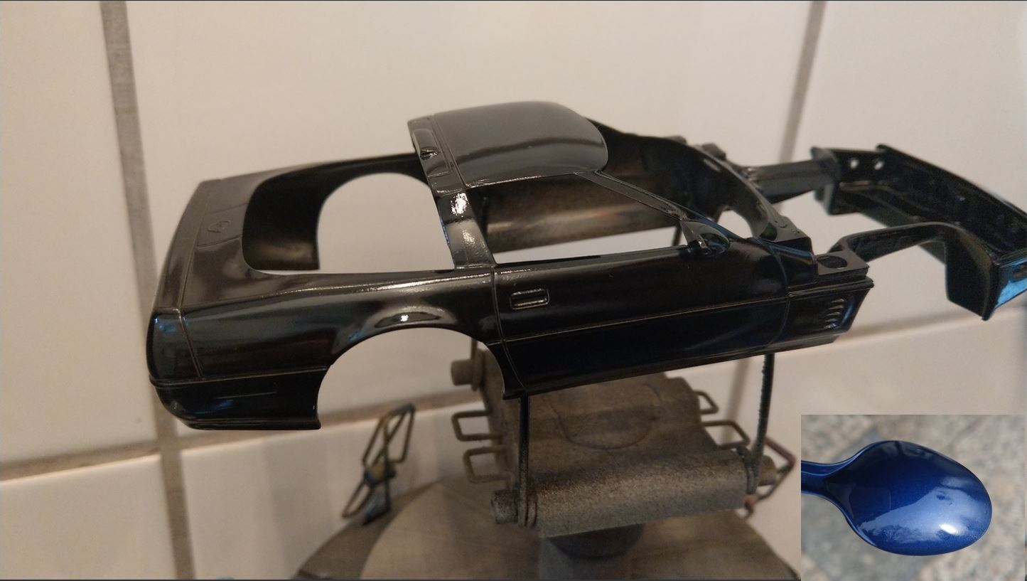 Die Karosserie ist nach einer ordentlichen Grundierung mir erfolgtem Nassschliff schwarz lackiert worden. Das bildet die Basisfarbe für mein gewähltes Dunkelblaumetallic. Lecker. Hätte auch auf Schwarz Bock gehabt. Aber ein Plan gilt es ja umzusetzen.