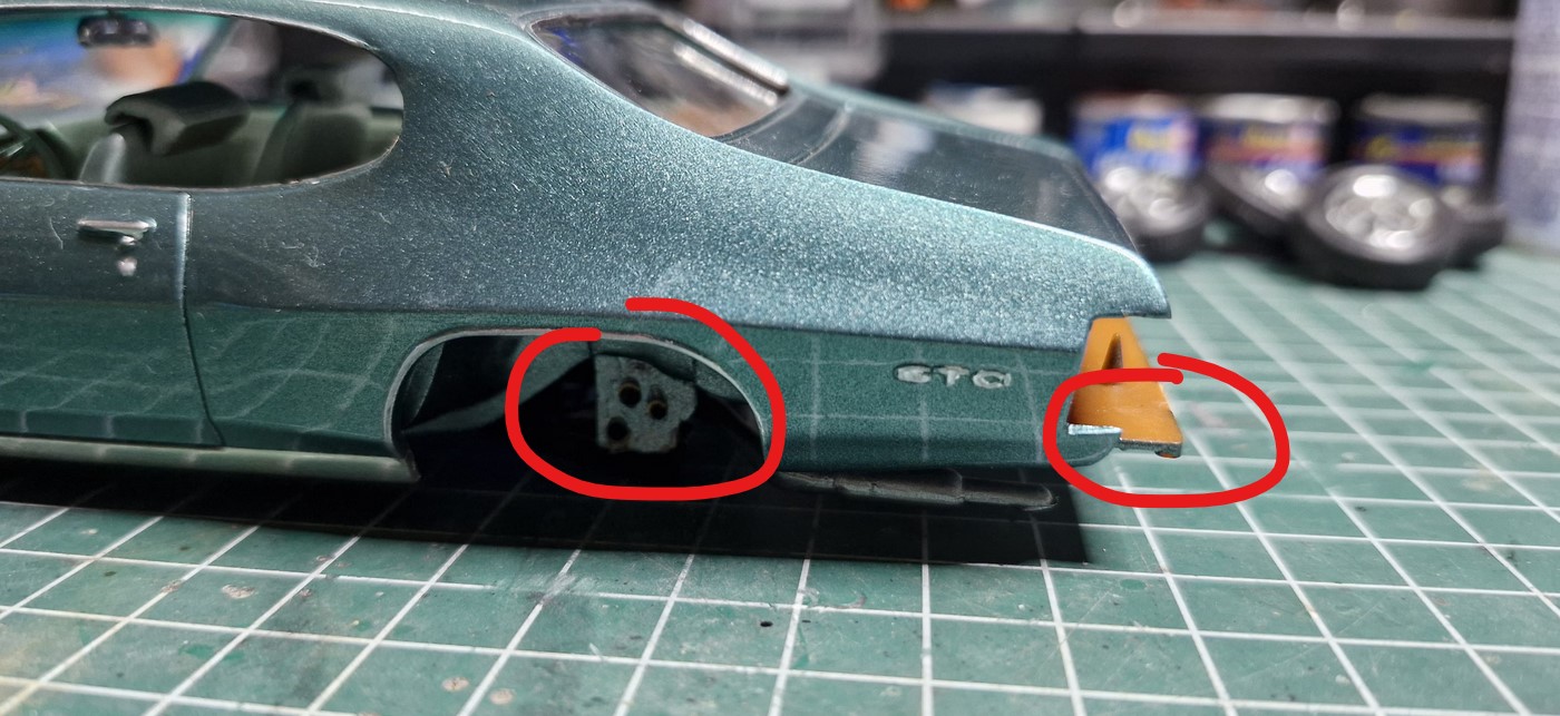 Was einfach dumm ist: der ganze Bereich um hintere Stoßstange. Die passt einfach nicht gut. Die Kofferaumkante war nicht 100%ig gerade und bei lackierter Karosserie, schleift man da nicht gerne rum. Weiter habe ich sie innen weitest gehend so ausgedünnt, damit es noch akzeptabel ausschaut. Da das Abschluss"blech" an der Stoßstange befestigt wird, konnte ich da auch nicht so weit gehen, wie ich wollte. Dann stünde entweder der Abschluss zu weit innen und die Seitenwände über oder ich hätte die Seitenwände auch kürzen müssen. Aber am Schlimmsten ist der seitliche Überhang. Das geht gar nicht. Im Original ist die eben mit den Seitenwänden. Daraus lerne ich: schau dir auch mal die Anbauteile an, ob die passen. Vor Allem bei den alten Bausätzen.