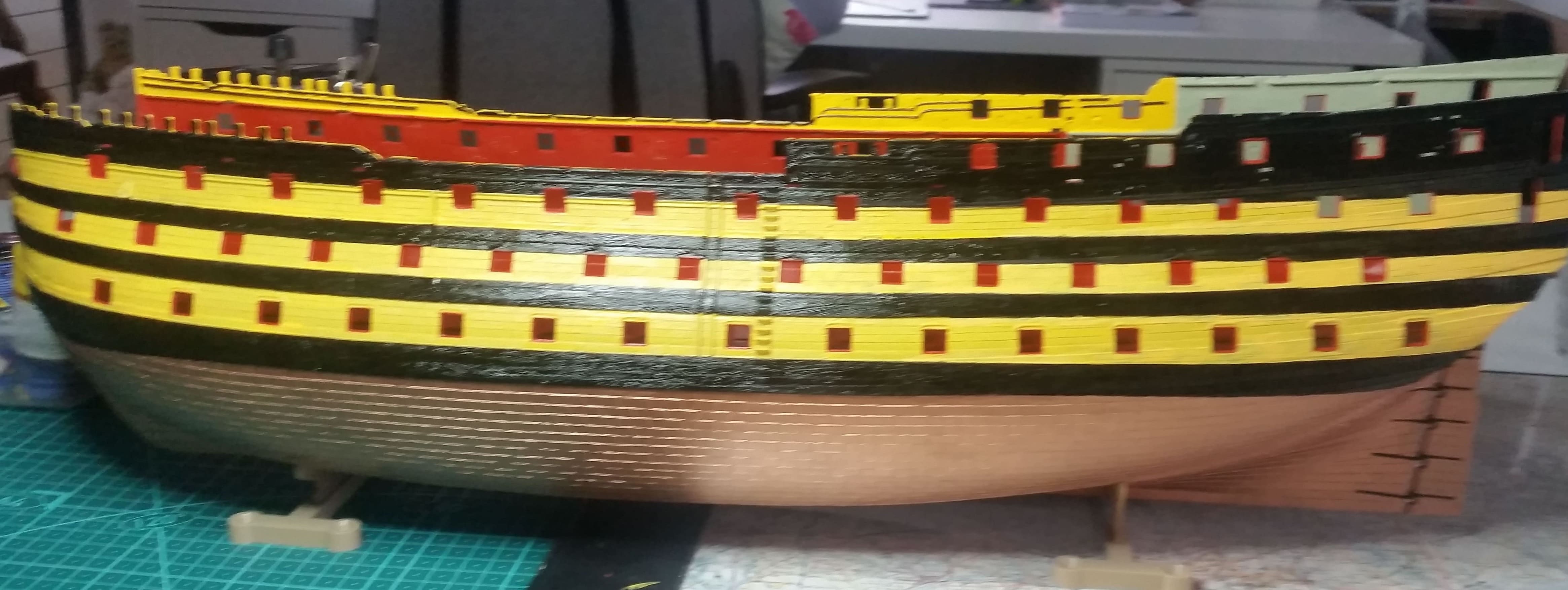 Was den Verlauf der Streifen angeht, ist denke ich auch etwas Entspannung da. Es kommt darauf an, willst du das Schiff so bauen wie es in Portsmouth steht? Da sind die Streifen tatsächlich so, dass sie die Pforten in den beiden unteren Decks nicht schneiden. Schaut man sich die Zeichnungen von William Turner an, scheinen die Streifen den Hölzern gefolgt zu sein, was auch bei den wenigen zeitgenössischen Modellen dieser Periode so ist. Außer wenn man sie genau so bauen will wie in Portsmouth heute, hat man doch einigen Interpretationsspielraum:-)