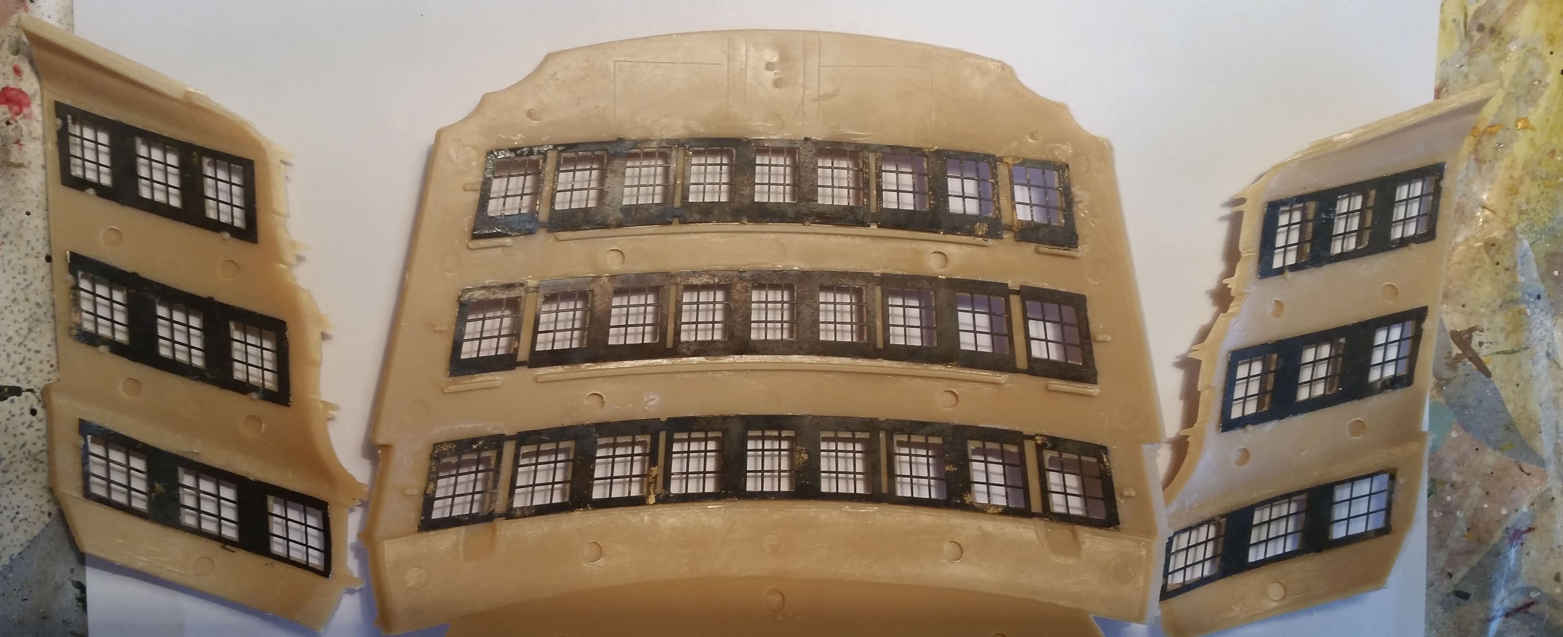 Inzwischen habe ich mit dem Heckspiegel begonnen. Die Fensterrahmen sind herausgetrennt worden und wurden durch die neuen brünierten Ätzteile von Dafi ersetz. Ebenso bei den Seitenteilen.Ansicht von hinten.