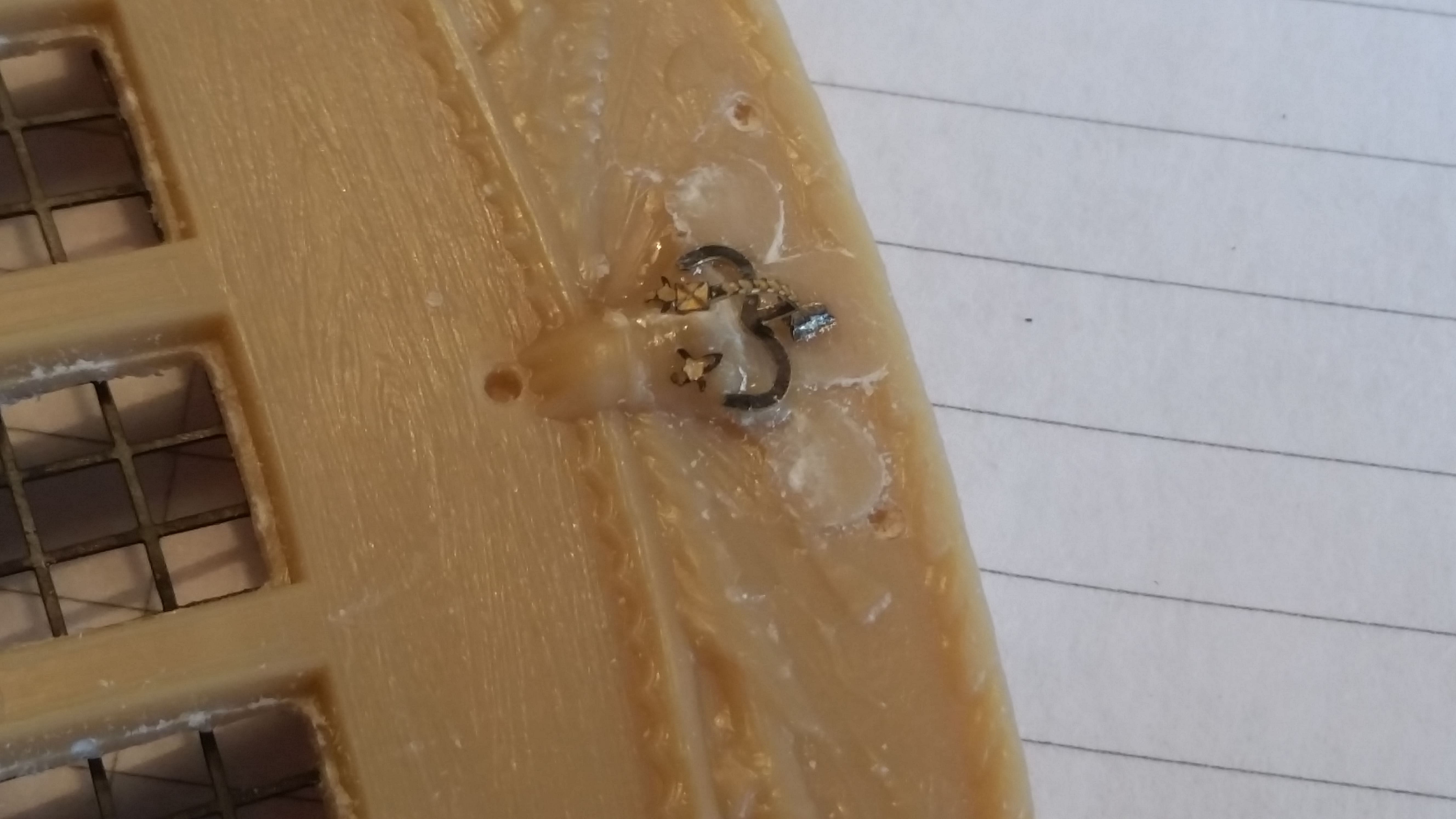 Heute kam ich gut voran. Den Namen Victory vom Heck abgeschliffen und mit Schablone neu angebracht. Die 8 Ösen angebracht und das obere Ornament am Heck angebracht. Die zu verwendenden Bauteile links.. Und dann noch mit der grün/weißen Mischfarbe (Ich nehme die Farbe Sky von Tamiya) innen angemalt.