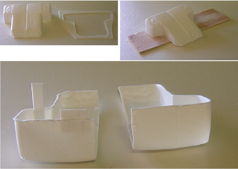 Führerhaus ausschneiden, planschleifen, an die Scheibe ( kommt hinterher wieder weg) und hinter der Sitzbank Klebehilfen ankleben.