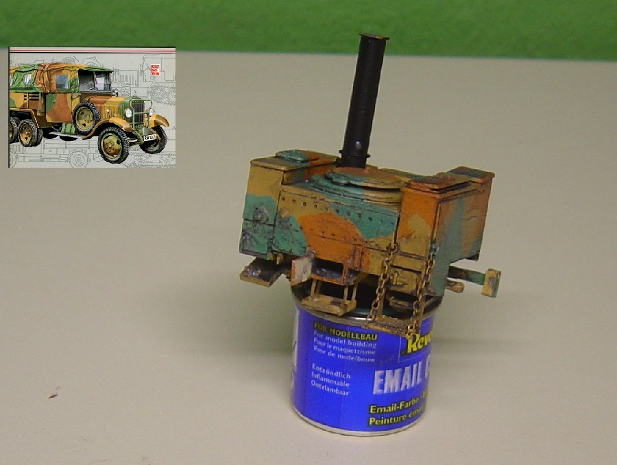 Als Farbanstrich für meine Tamiya Feldküche ( Click ) habe ich die Reichswehrfarben genommen. Ich glaube das daß Braun im Original dunkler war, aber ich habe mich von dem G3 auf dem Schutzumschlag von Walter Spielberger´s Buch " Die Fahrzeuge der Reichswehr" verleiten lassen. Hier ist das Braun sehr hell. Im Original war es ( nach meiner Meinung ) mehr Schokoladenbraun, fast Zartbitter