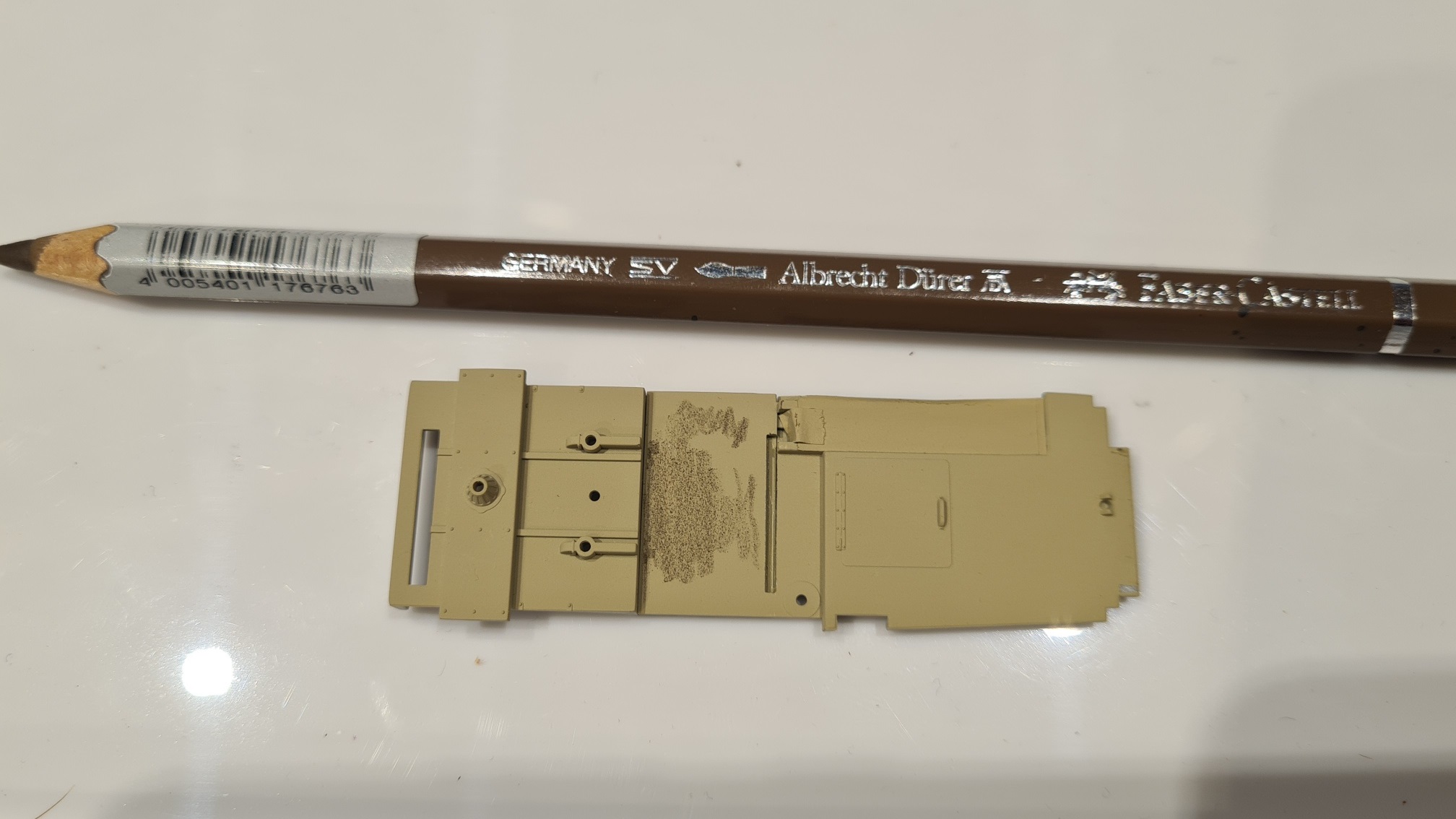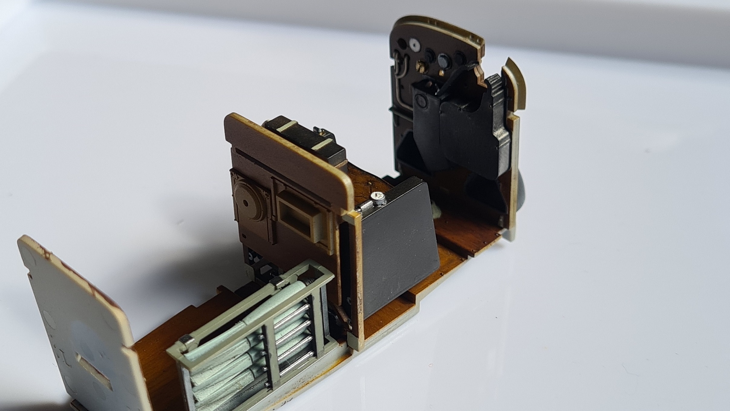 In obigem Bild kann man sehen, dass ich den Tank der Rückenlehne abgeklebt habe. Zu diesem Zeitpunkt war der nur schwarz, noch kein Messing drauf. Ich vermute, ich hätte sonst vom Klebeband unschöne Streifen im Messing gehabt. Gesprüht wurde beides dann mit XF-52, wie im Bild zu sehen.