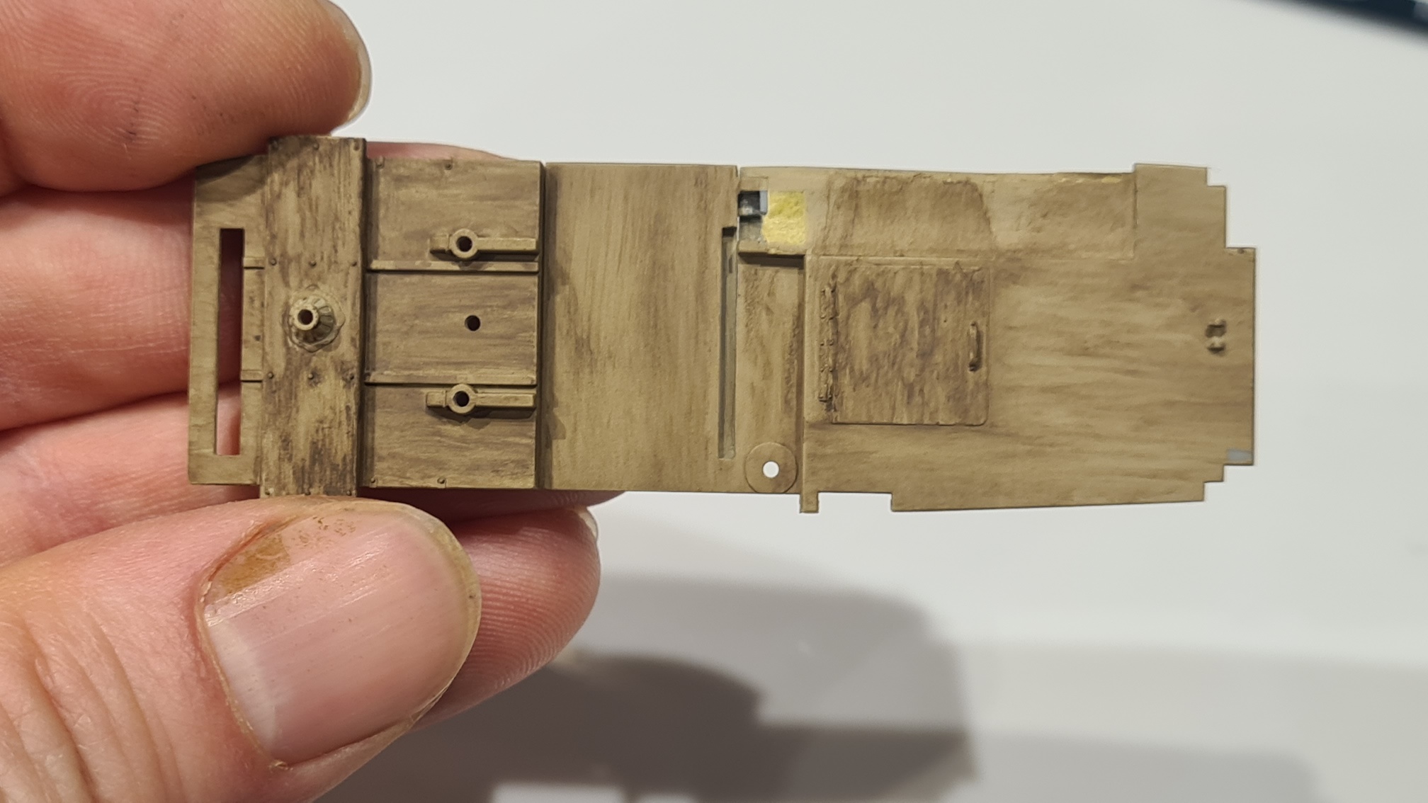 Nach dem Trocknen wurde mit dunkelbraunem Klarlack übersprüht. Mischungsverhältnis etwa 6 Teile Clear Orange / 3 Teile Clear Blue / 1 Teil schwarz (Tamiya X1). Der Glanz wurde anschließend mit einer Schicht Klarlack seidenmatt genommen.
