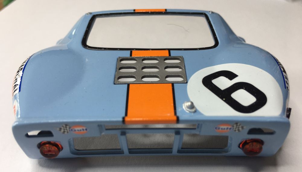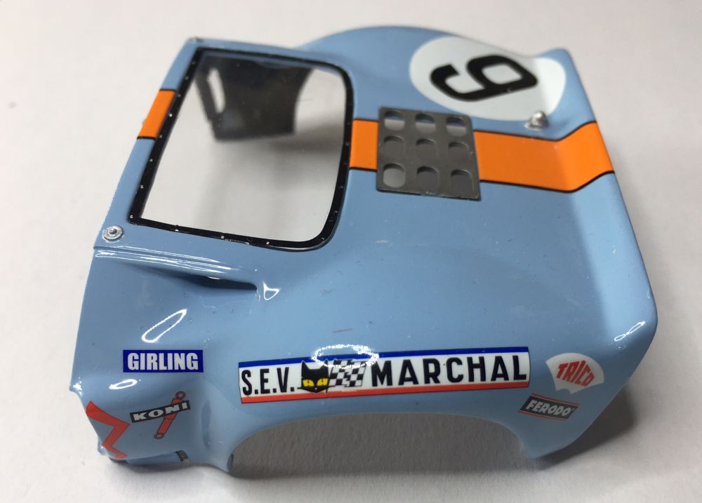 Ich habe die Karre aus 1969 mit Jacky Ickx gebaut, die nach Anleitung keine schwarzen Rahmen um die Scheinwerfer hat. Allerdings habe ich auch Bilder der Nr.6 mit diesen Rahmen gefunden, so dass ich diese dankbar verwendet habe, da die Übergänge zu den Klarsichtteilen nicht so super waren.
