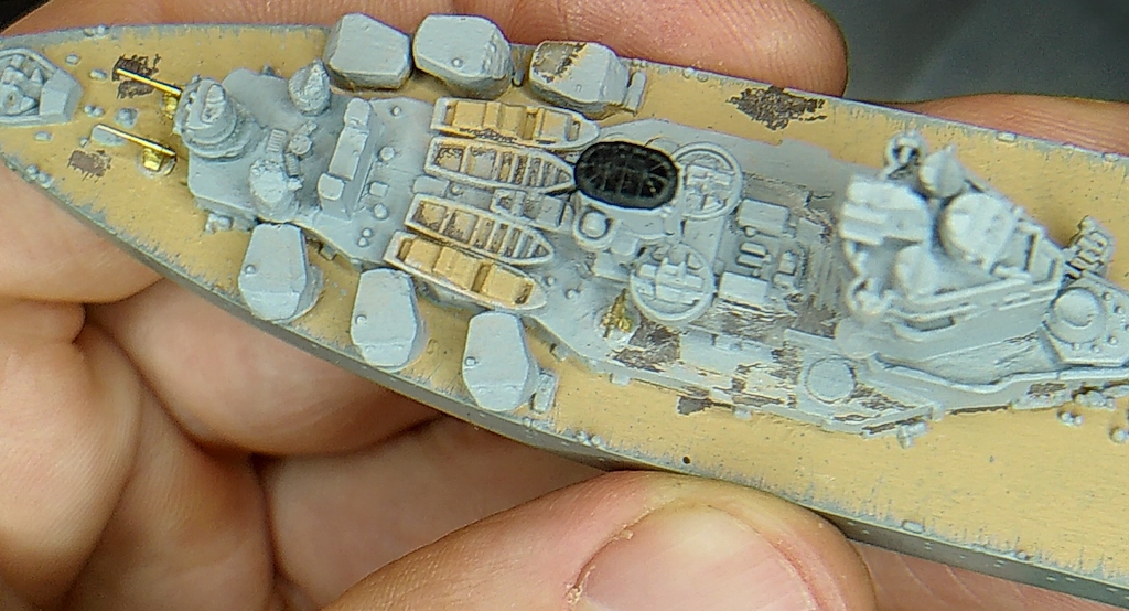 Folgende Änderungen (nicht abschliessend) stehen für die 1941er Version an: Verfeinern der schweren Artillerie (1), Verfeinern der mittleren Artillerie (2), Ersetzen des Flugzeugkrans (3), Entfernen der meisten leichten AA (4), Verfeinern der 4er PomPom-Geschütze (5), Verfeinern der 8er PomPom-Geschütze (6), Neubau der schweren AA (7), Neubau des vorderen (8) und hinteren Mastes & Antenne (9), Rückbau der Anbauten am Kommandoturm (10) - die Ende 1941 angebauten U-Boot-Ausgucke lasse ich aber dran, weil das Wegkratzen an der Struktur wohl zu grossen Schaden anrichten würde, Verfeinern des Schornsteins (11), Anpassung der Reling (12), Ersetzen der Treppenaufgänge (13), Ersetzen der Charley floats (14), Entfernen der 8er PomPom-Geschütze auf dem Achterdeck und ersetzen durch Entfernungsmesser (15), Verfeinern externer Strukturen (16), Verfeinern der Beioote (17), ...