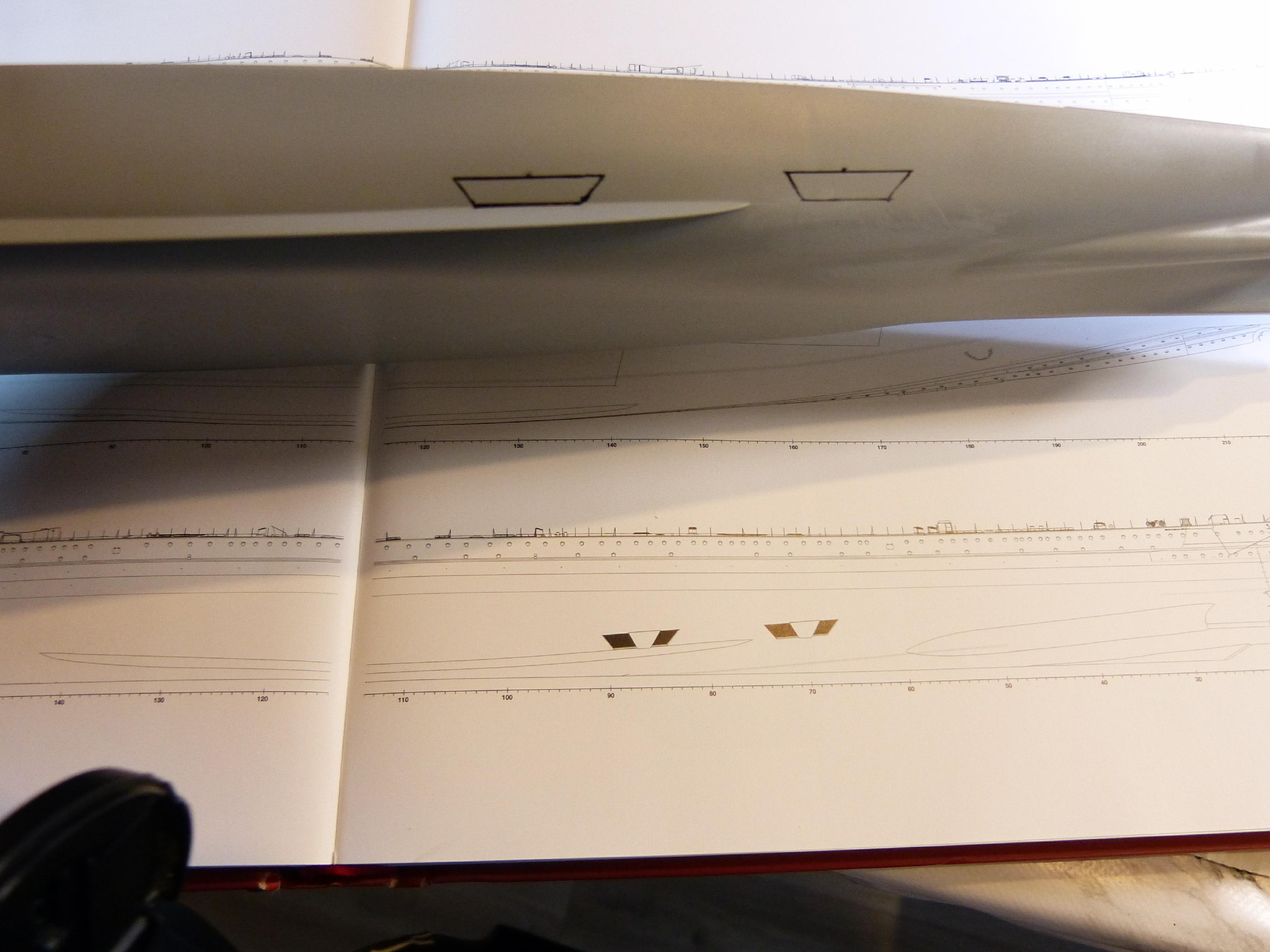 Zunächst zeichnete ich mittels wasserfestem Stift die Einlässe maßstabgerecht auf den Rumpf, und zwar einer steuerbords und zwei an backbord.
