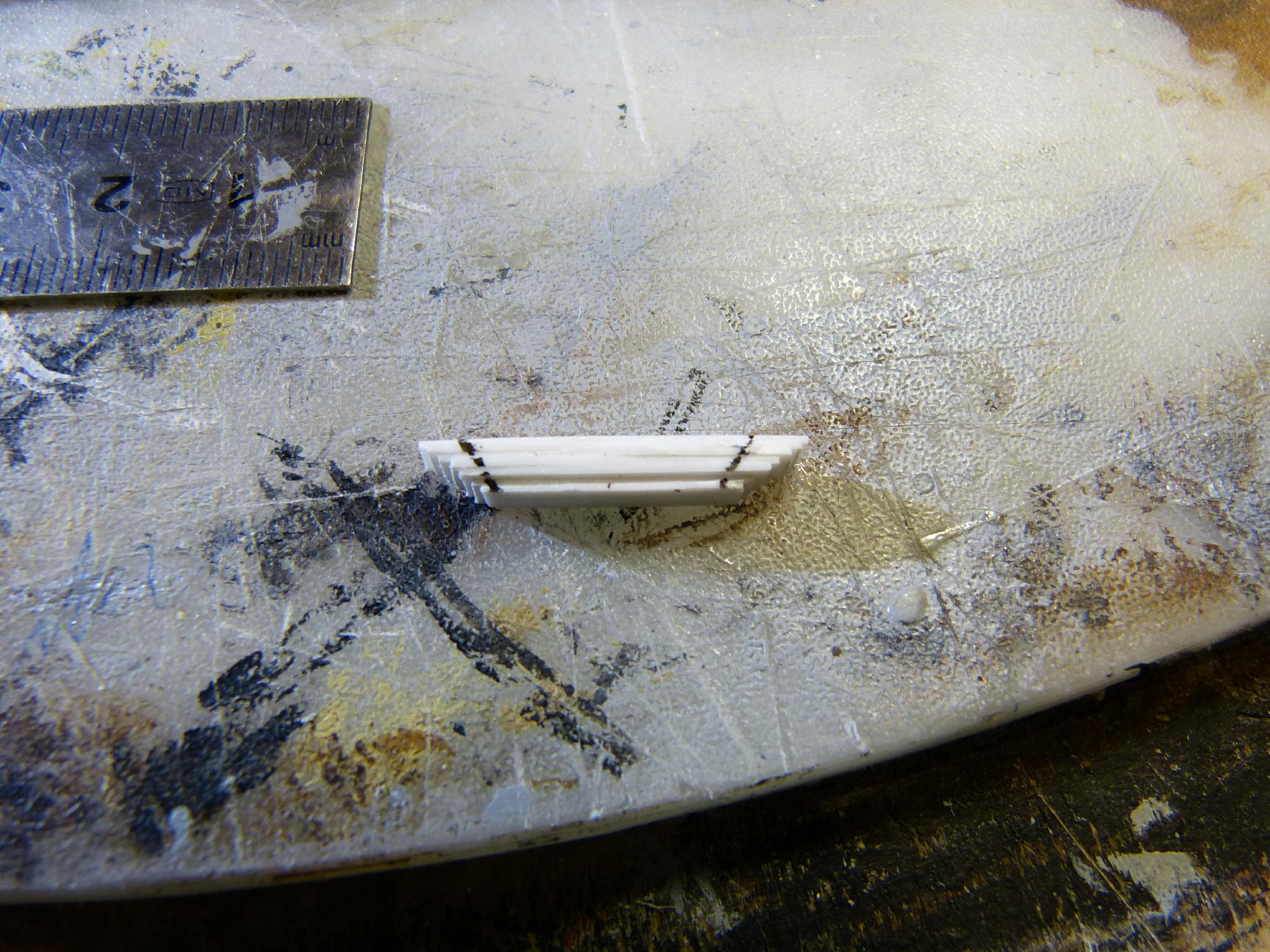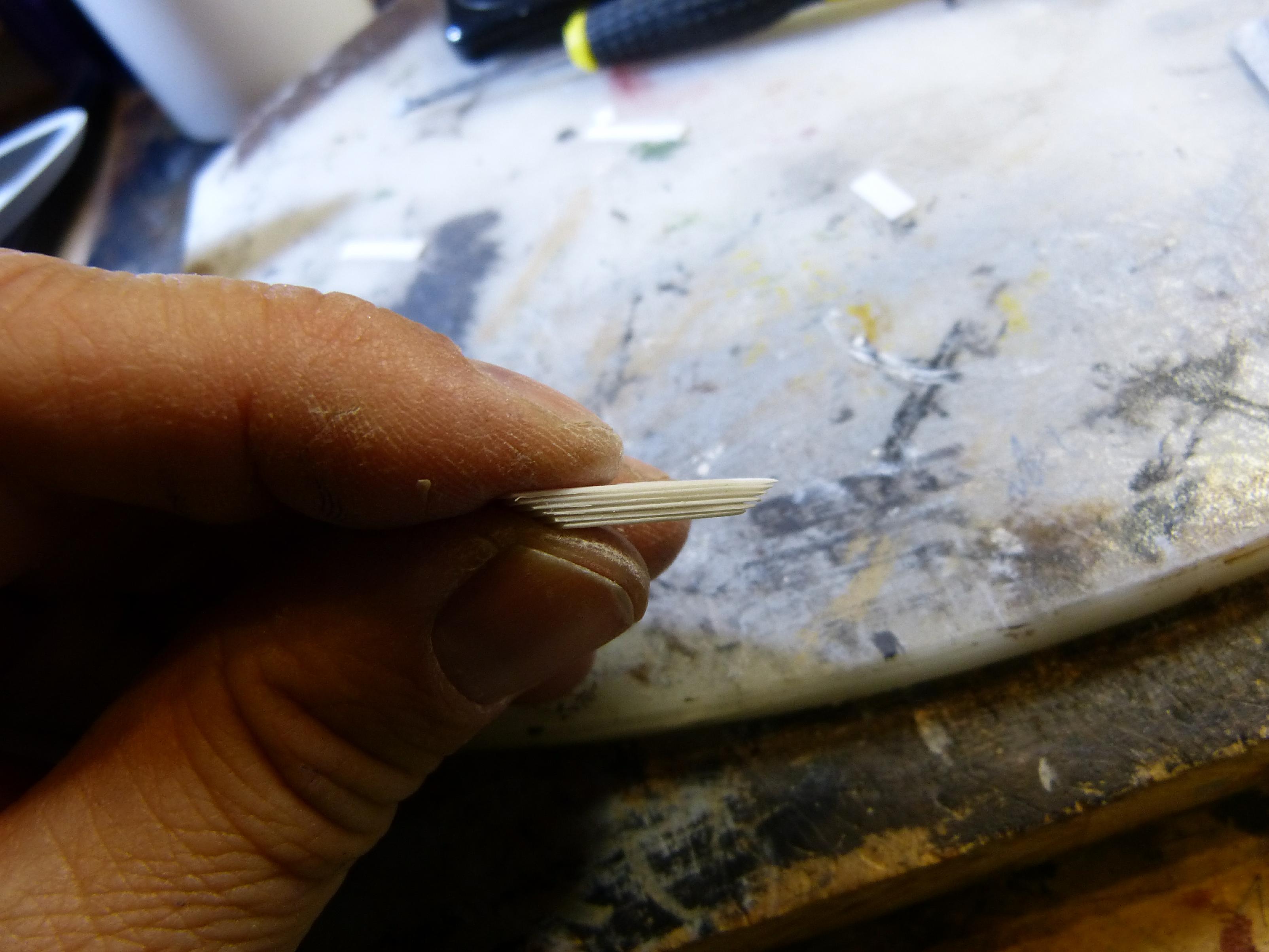 Nun grob zunehmende Längen dünnen Plastiksheets zurechtgeschnitten, dabei jeweils eine lange Seite konisch angeschliffen (wie bei einem Messer). Insgesamt sieben Stück. Anschließend übereinander geklebt und auf die passende Aussparung im Rumpf zurechtgeschnitten.