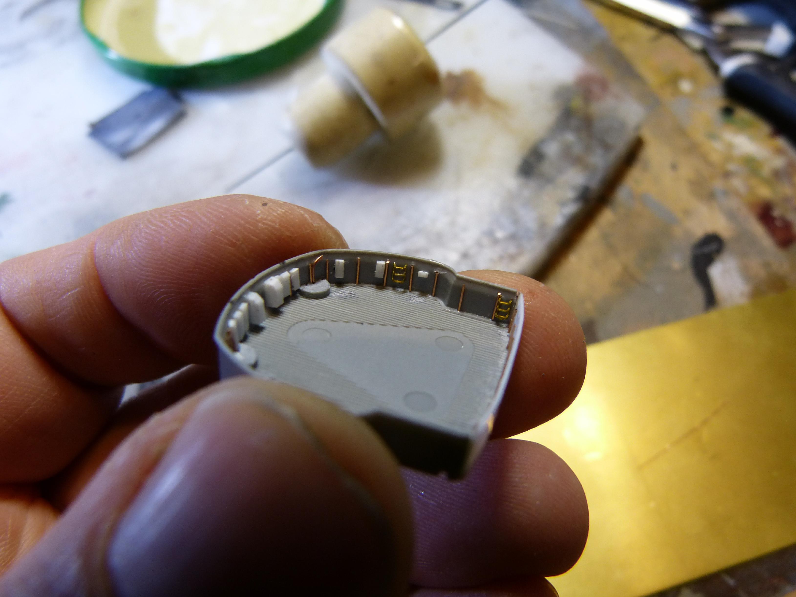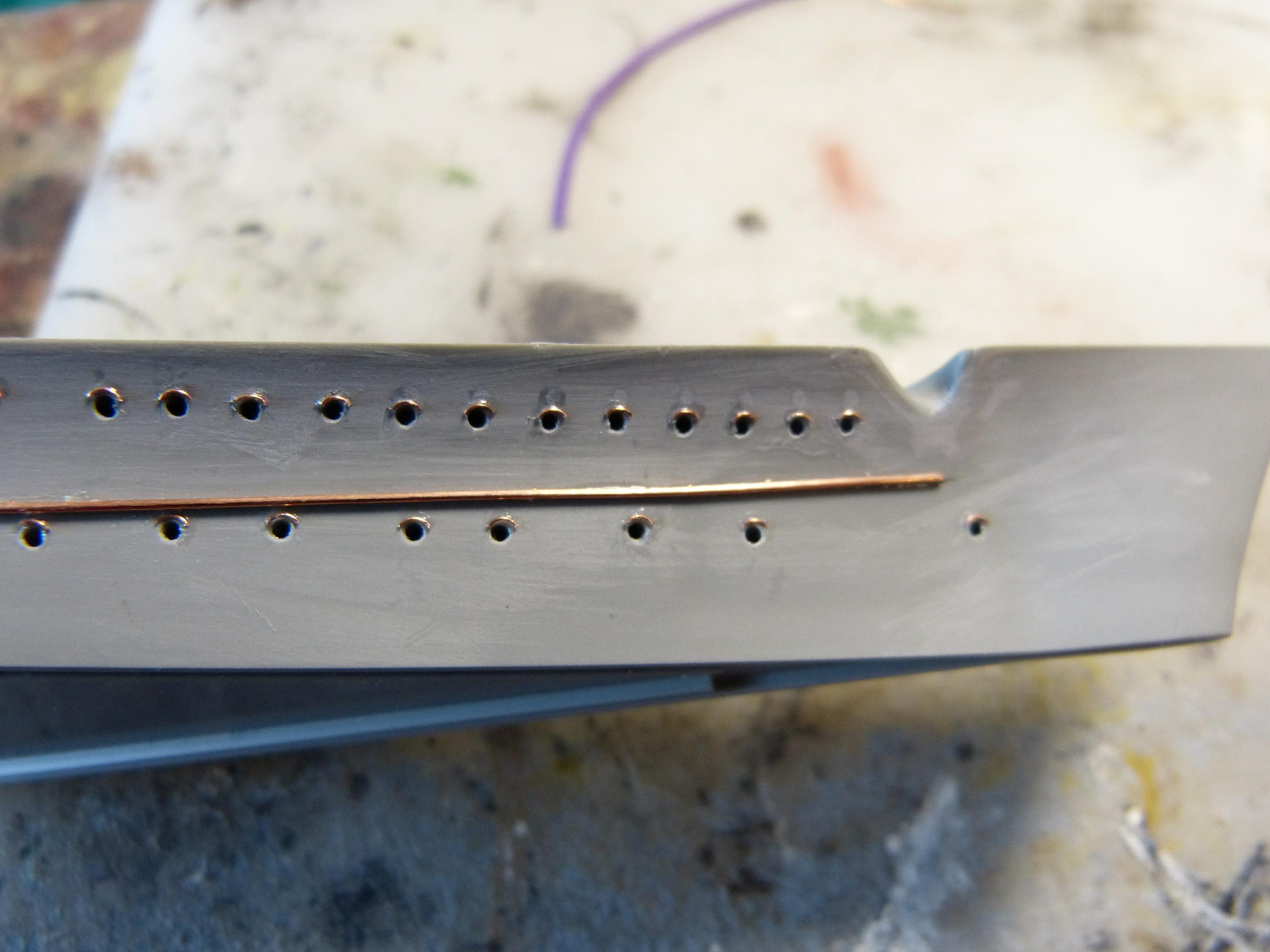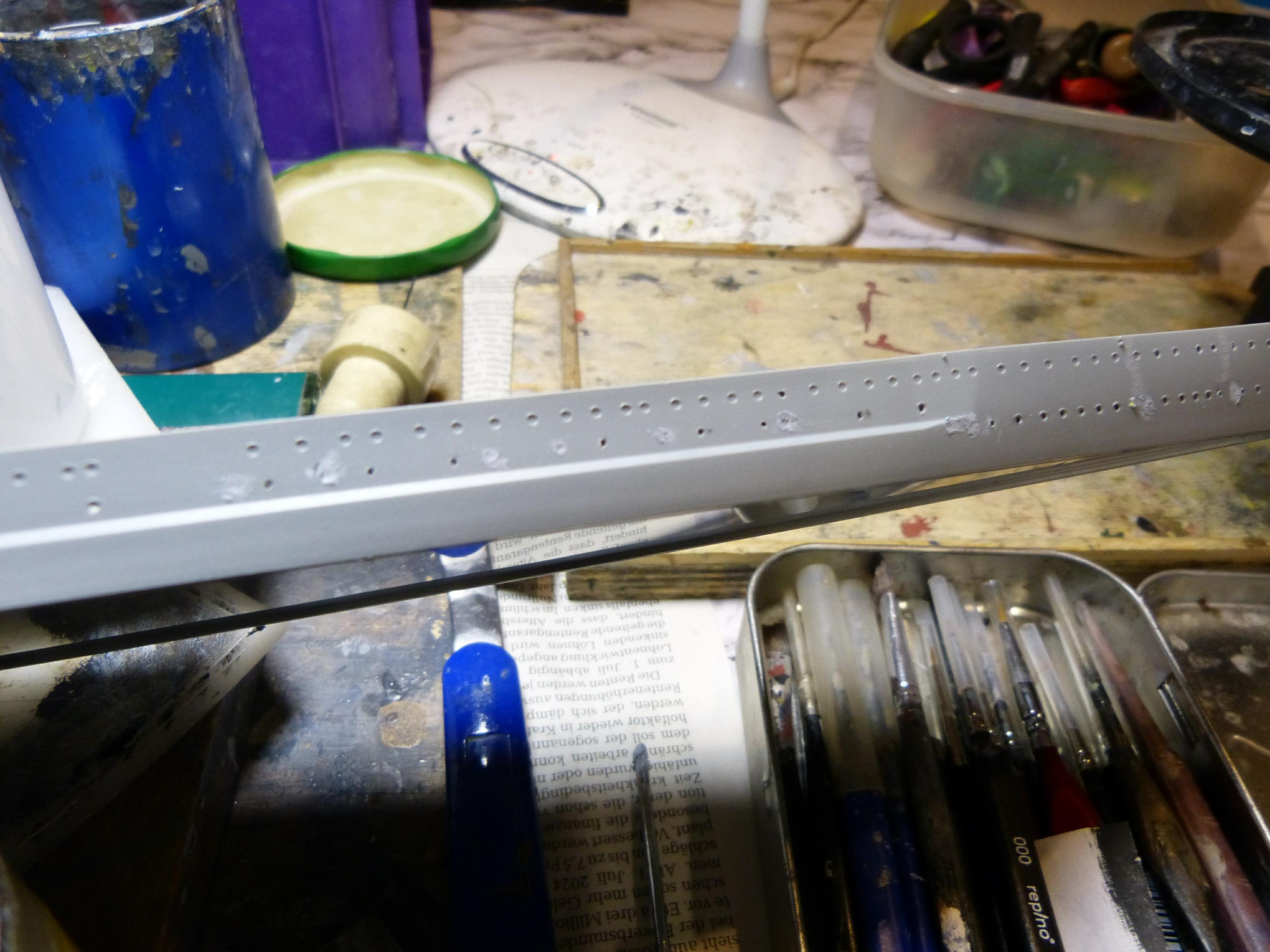 Beim Vergleich mit meiner Buchvorlage stellte ich weiter fest, dass auch andere Bulleyes überflüssig oder fehlend waren. Gleiches Spiel also auch an anderer Stelle. Übrigens, beim Neubohren fiel mir noch auf, dass die Bulleyes am Dragon-Rumpf zu klein geraten waren. So nahm ich mir vor, alle 369 Bulleyes auf 1,1 mm aufzubohren. Leider geht dabei auch der Laufwasserschutz (halbkreisförmiger Rand oberhalb jeden Bullauges) flöten, so dass ich alle neu mit Cu-Litze scratchen muss.
