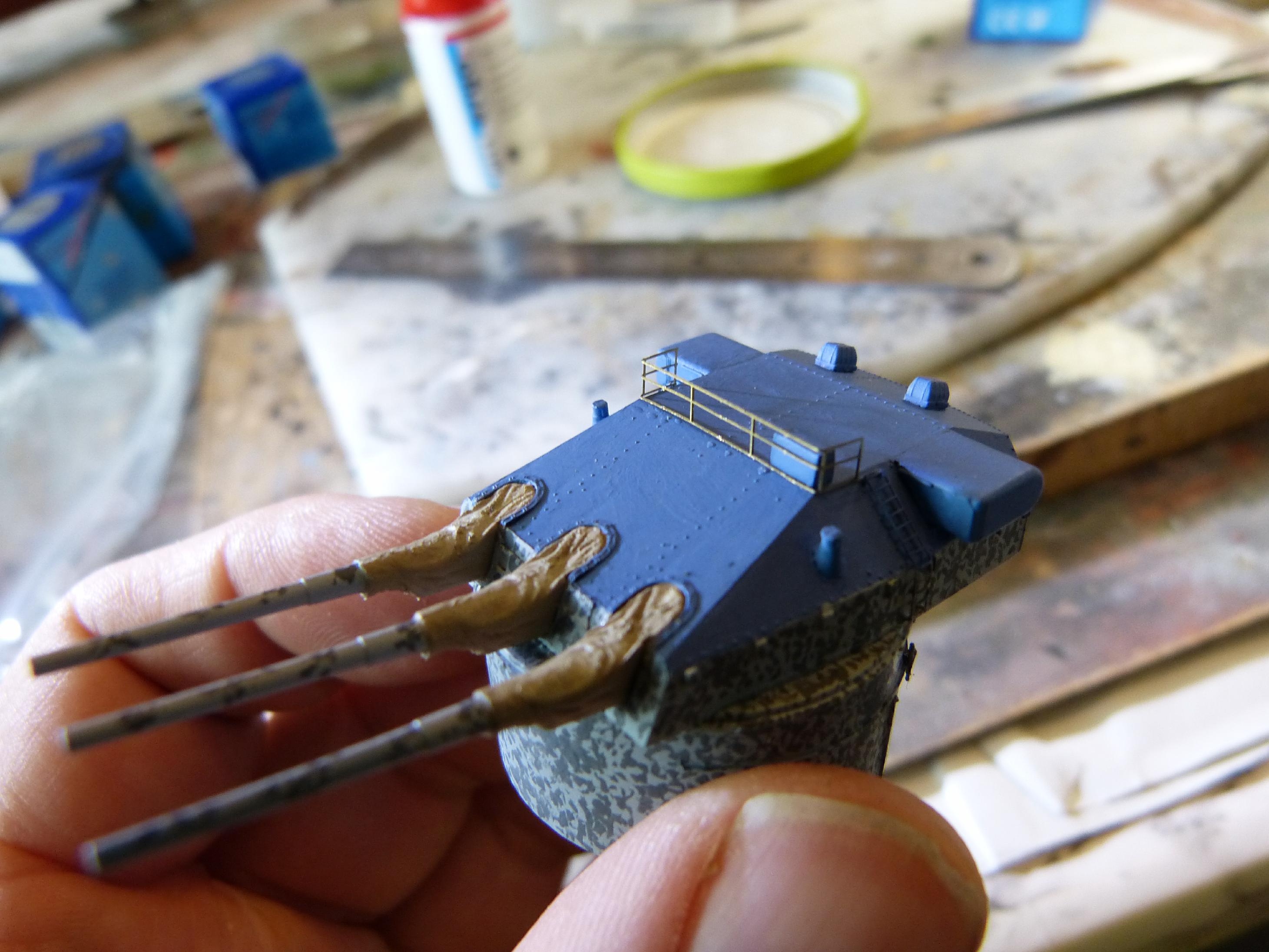 Danach hatte ich große Lust, mal das eigentümliche Tarnmuster in Verbindung mit dem Blauton zu sehen, dazu baute ich den Turm Anton. Hierzu verwendete ich historisch korrekt das im Bausatz (für die 43er Variante) enthaltene Bauteil ohne E-Messer, denn die waren 1942 schon dichtgesetzt worden. Etwas schade finde ich, dass man die Türme nicht drehbar gestalten kann, denn Turm und Barbette sind fest miteinander verbunden. Der Turm wurde aus den Dragon-Teilen (nebst Rohrhosen), sowie KA-Ätzteilen und Master-Geschützrohren zusammengebaut, anschließend mit RAL7001 bemalt, die Hauben in hellblau (Rev 56+05), die Rohrhosen in beige (Rev 89). Zuletzt mit einem 3/0er Retuschierpinsel das Tarnmuster in RAL7024 (Rev 74) aufgetragen. Finde, der Turm ist ganz gut gelungen und das hellblau passt ausgezeichnet.