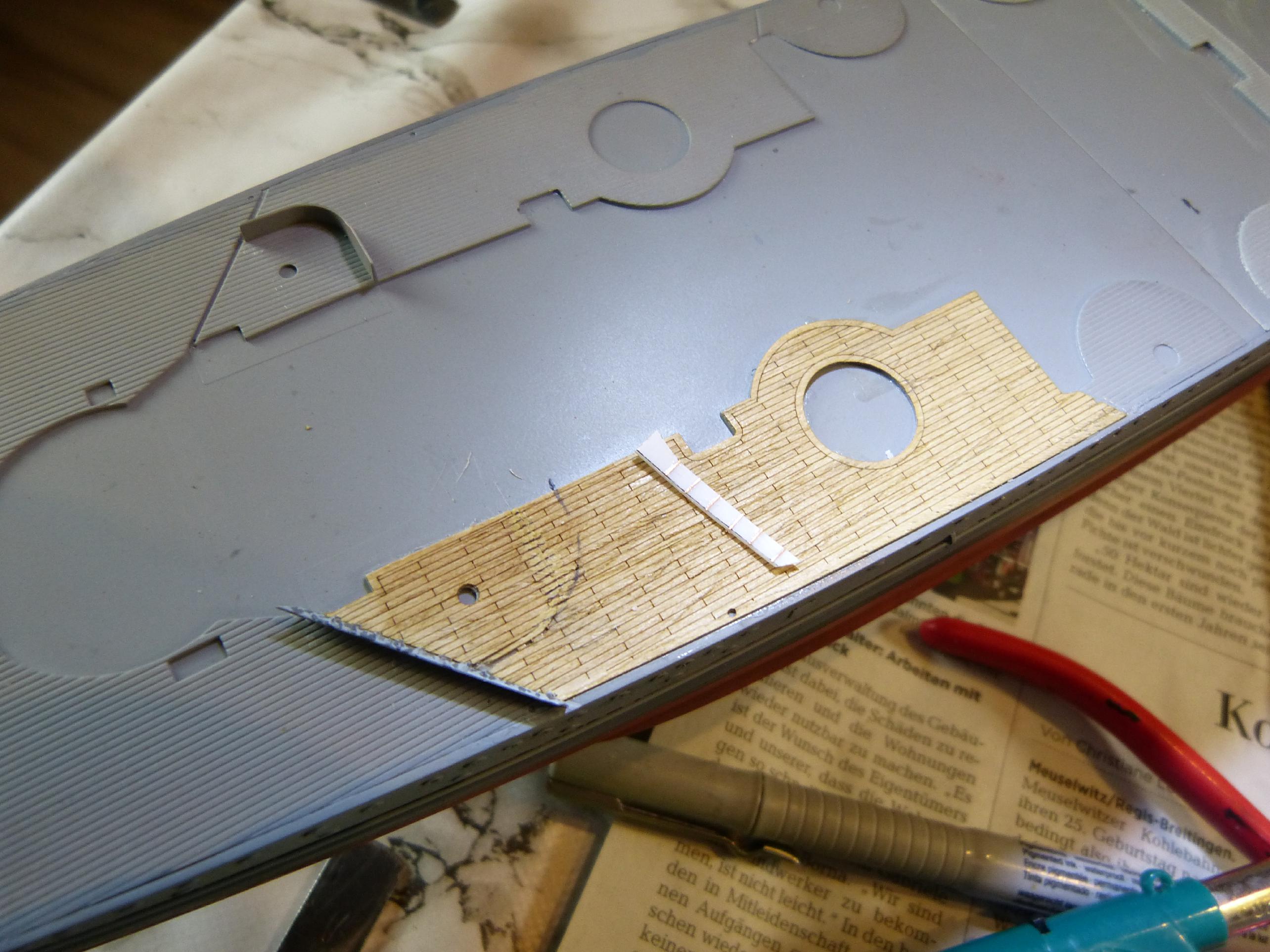 Zum Glück gab es einige Holzdeckteile, die ich nicht verwendet habe. Aus diesen schnitt ich exakt die passende Plankenstruktur…