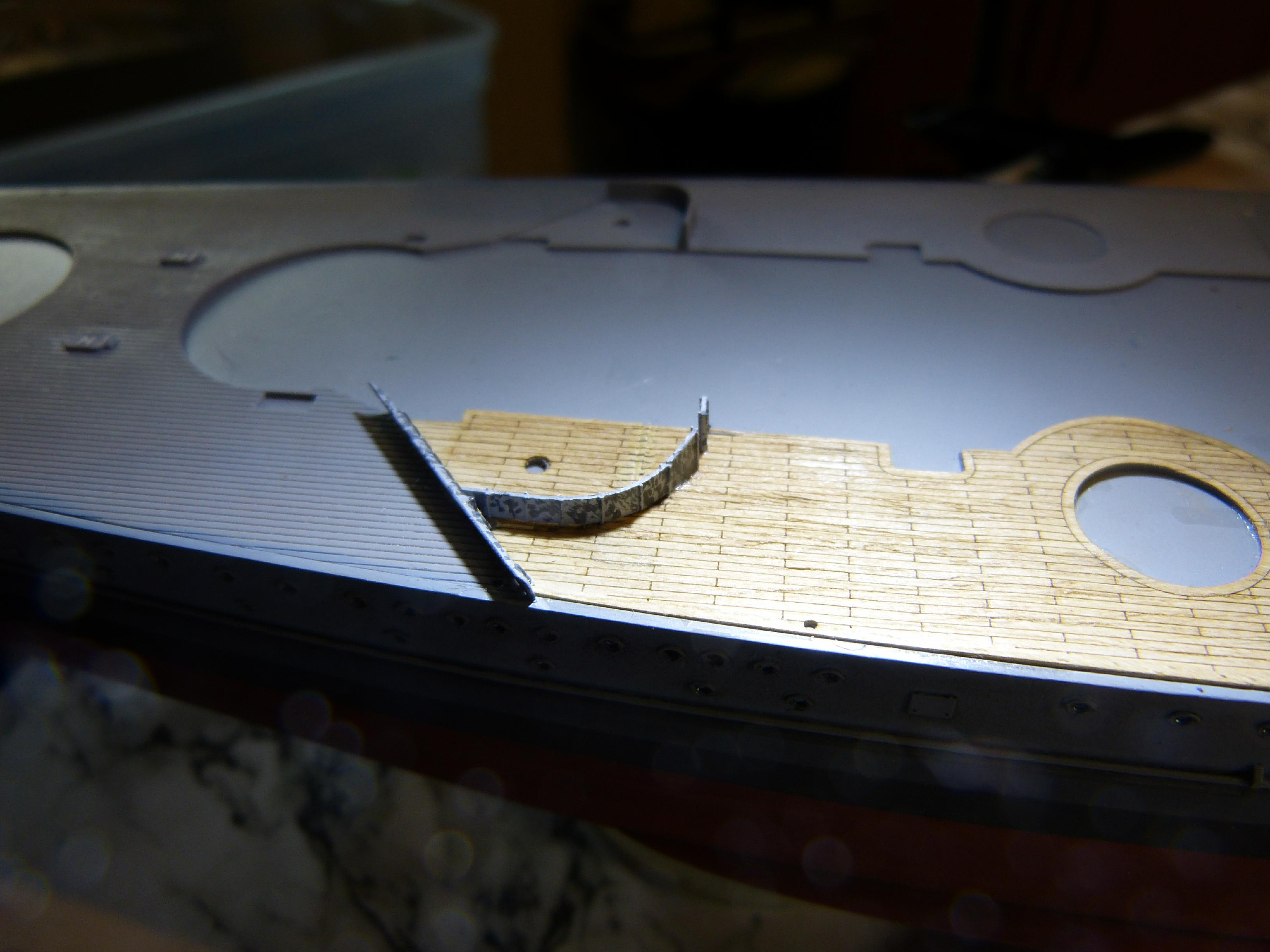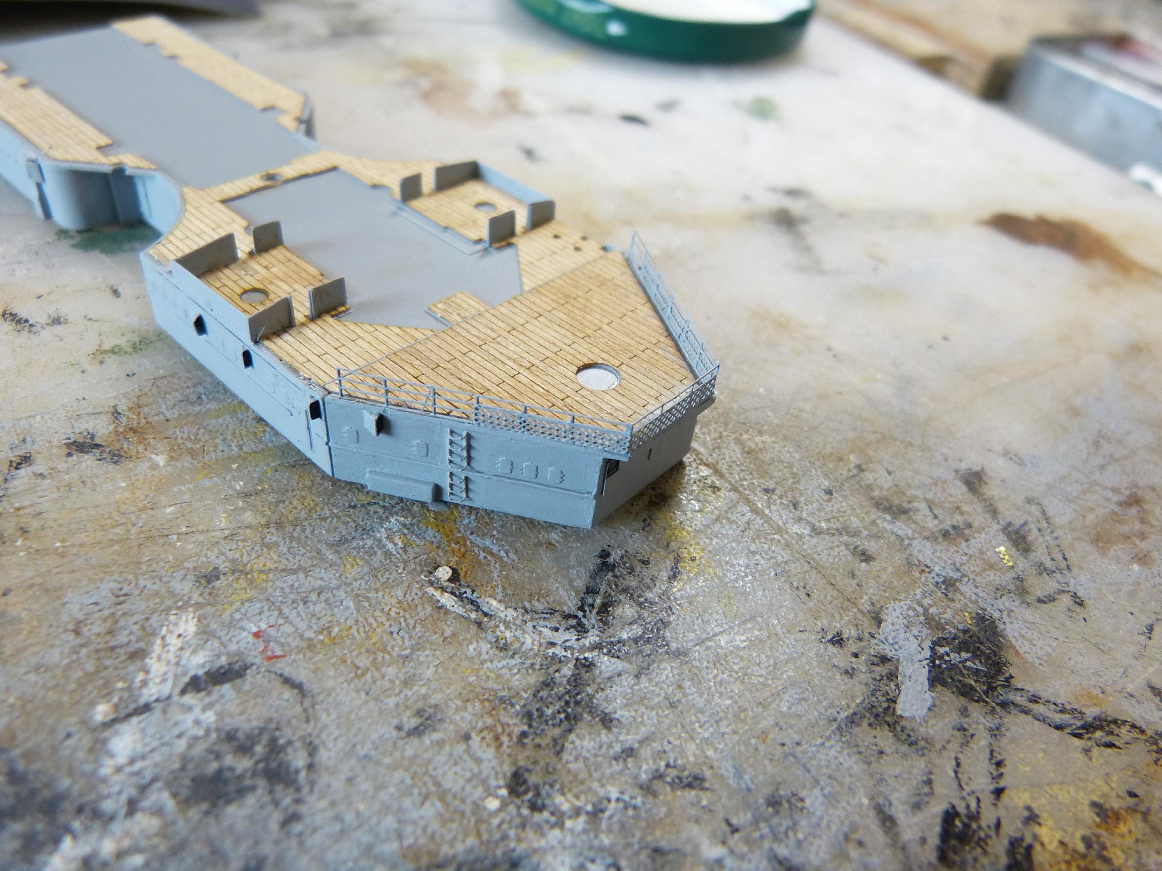 Beim hinteren Teil des Holzdecks war auch wieder etwas Improvisationsgeschick gefragt. Das Deck ist für den 41er Bausatz, d.h. das Deck hinten hat eine Aussparung für den Flugzeugumsetzkran, wobei dies nicht korrekt ist, denn Katapult nebst Kran wurden schon im Frühjahr 1940 ausgebaut.