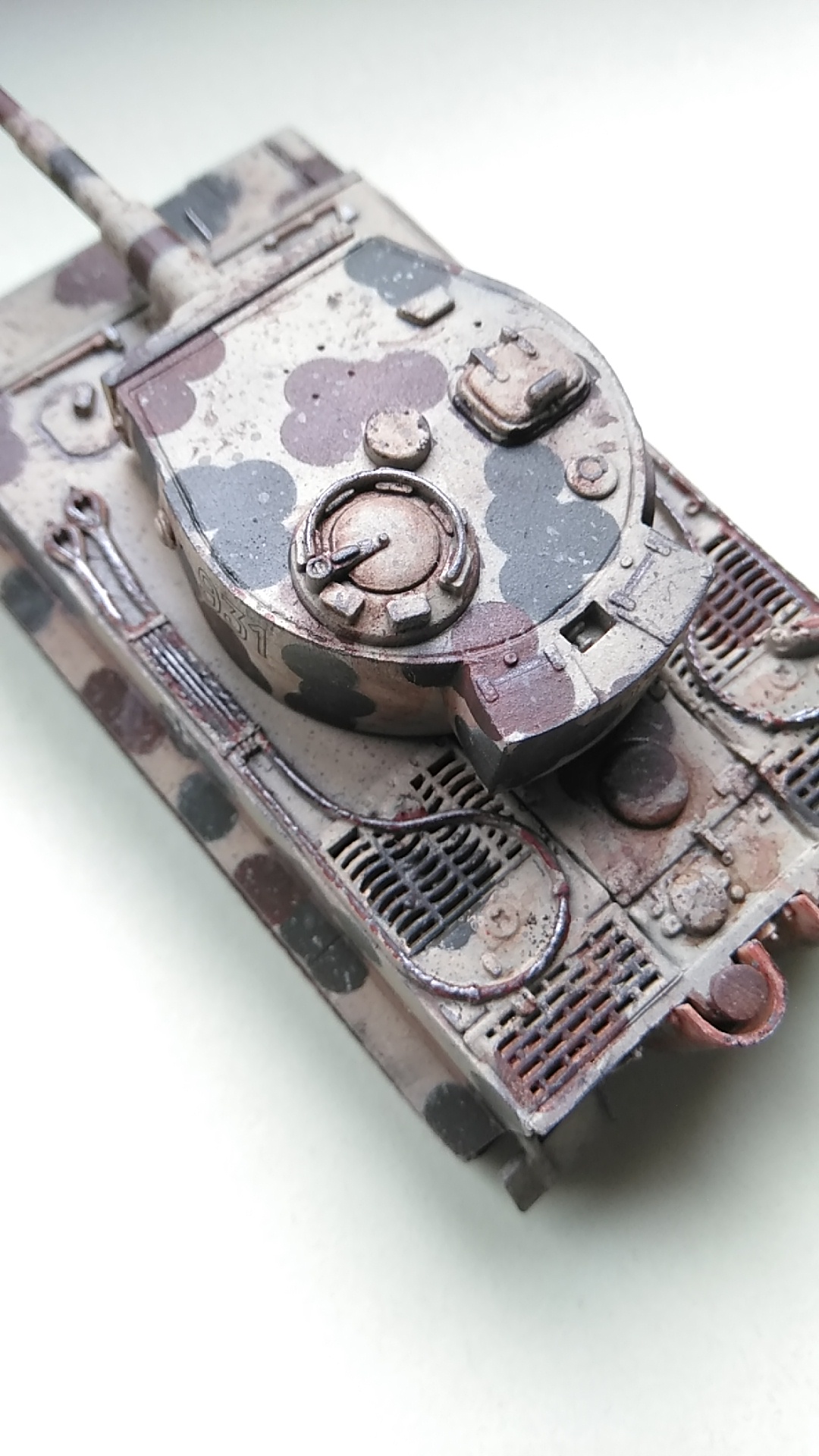 Prinzipiell sehr gut lackiert, aber das Tarnschema ist falsch skaliert. So wie du es gemacht hast, wirkt sie viel zu groß. Das passt eher für 1:35 oder 1:16