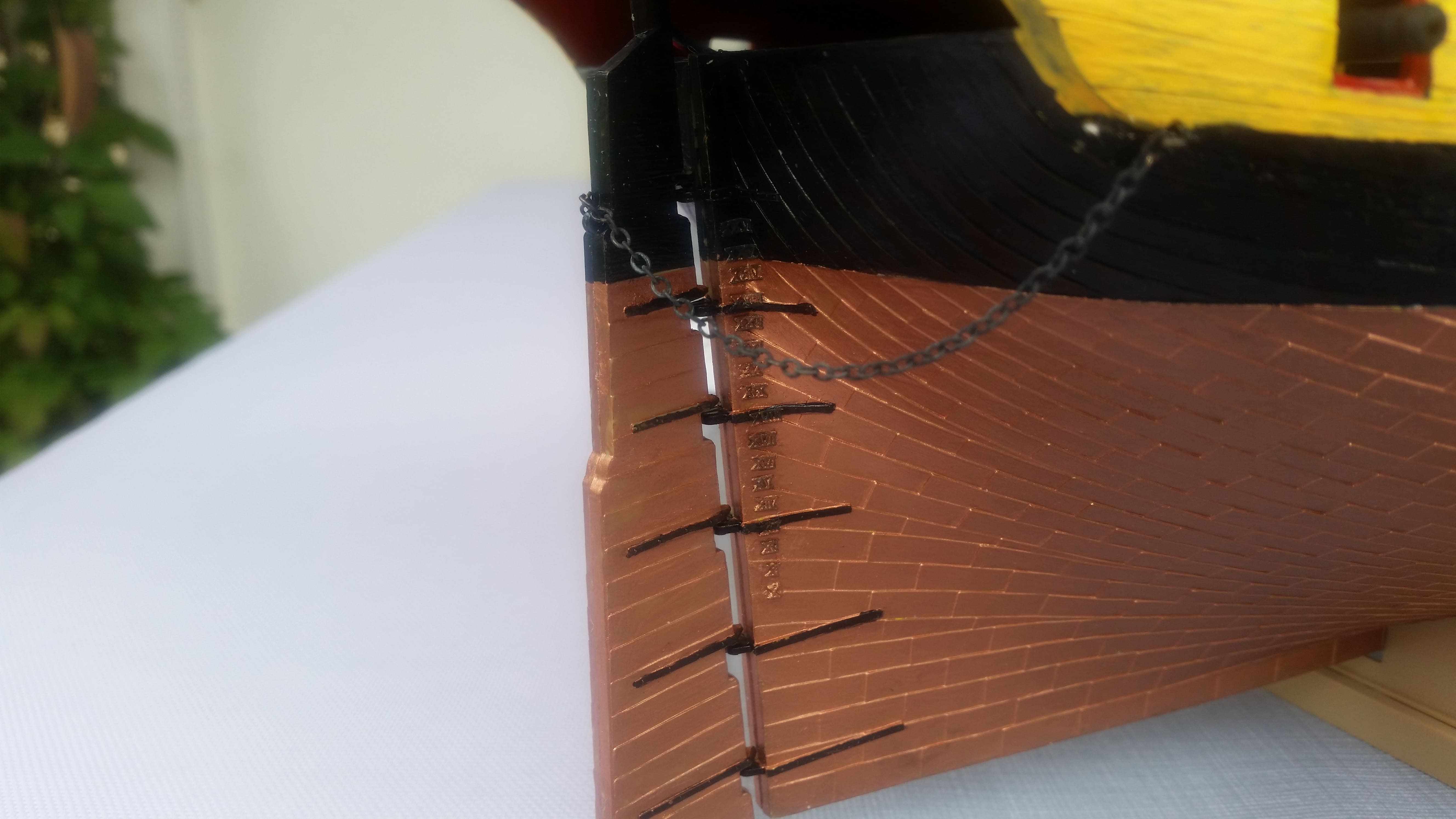 Dieses Wochenende habe ich mich mit den Tiefgangsmarken (Ahmings) beschäftigt. An beiden Bugseiten jeweils 16 Stück, am Heck je 17. Ich hatte befürchtet, daß man die Skala nicht mehr erkennen wird wenn Kupfer Farbe aufgetragen wird. Aber man erkennt es noch sehr gut.