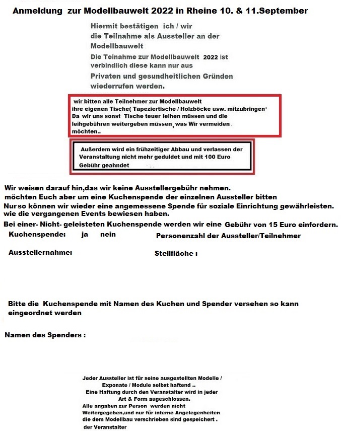 Wer als Einzelperson oder Club / Verein noch Intresse verspürt und zur Modellbauwelt in Rheine 2022 ausstellen möchte