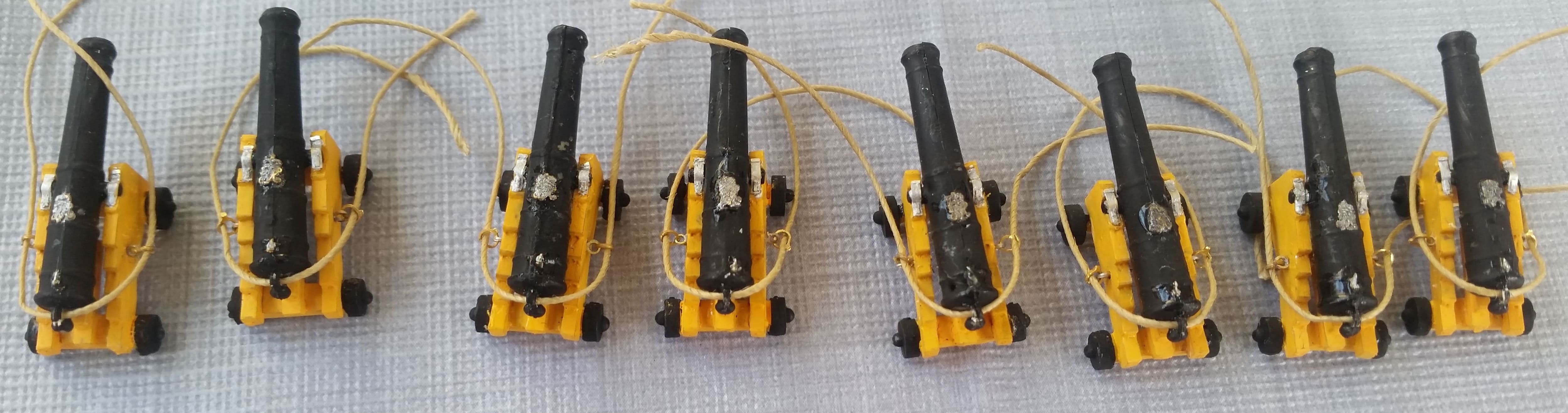 Ein paar Geschütze 24 Pfund sind auch schon montiert, diesmal habe ich dickeres Tau genommen und gleich bei der Montage der Ringe mit eingezogen.