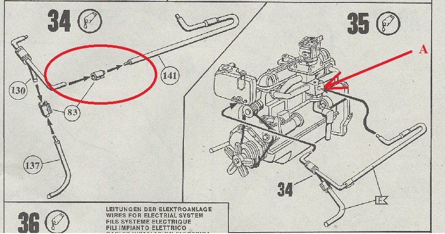 Das nächste Rätsel war die Kühlwasserleitung. Das Verbindungsteil -83- hat eine große Öffnung für Teil -130- und eine kleine für den Stift von Teil -141-. Leider nicht, es befindet sich eine durchgehende Bohrung mit ,01 mm Spiel zum großen Teil und cirka 1,2 mm zum kleinen Teil. Baustufe -35-, die Kühlwasserleitung verbindet den Vorratsbehälter mit dem ?? - A -Auspuffkrümmer?? Macht technisch Sinn :lol: Des Rätsels Lösung, ein nicht geöffnetes Loch neben dem Krümmer. War wahrscheinlich der Stift in der Spritzgussform zu kurz.
