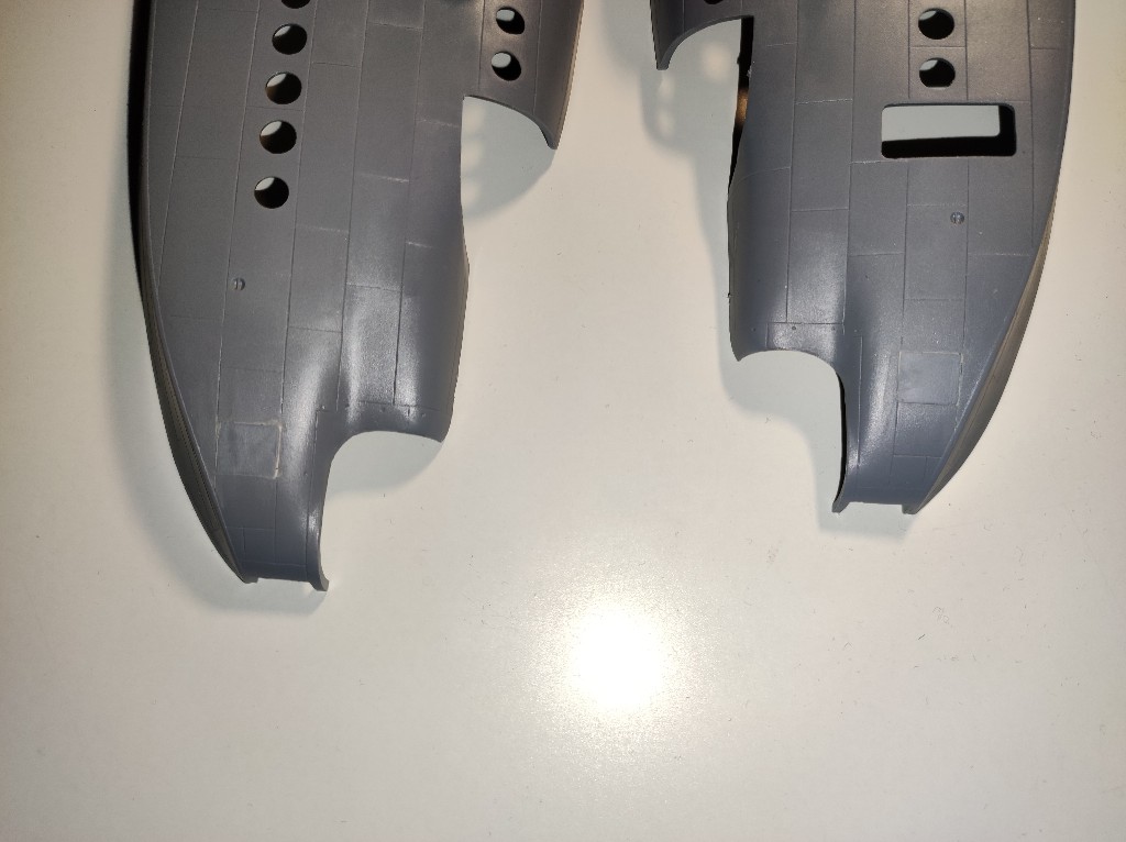 Und nun geht's an die wirklich großen Teile: die Rumpfhälften, hier wurden zunächst an der Nase kleinere Platten eingeklebt.