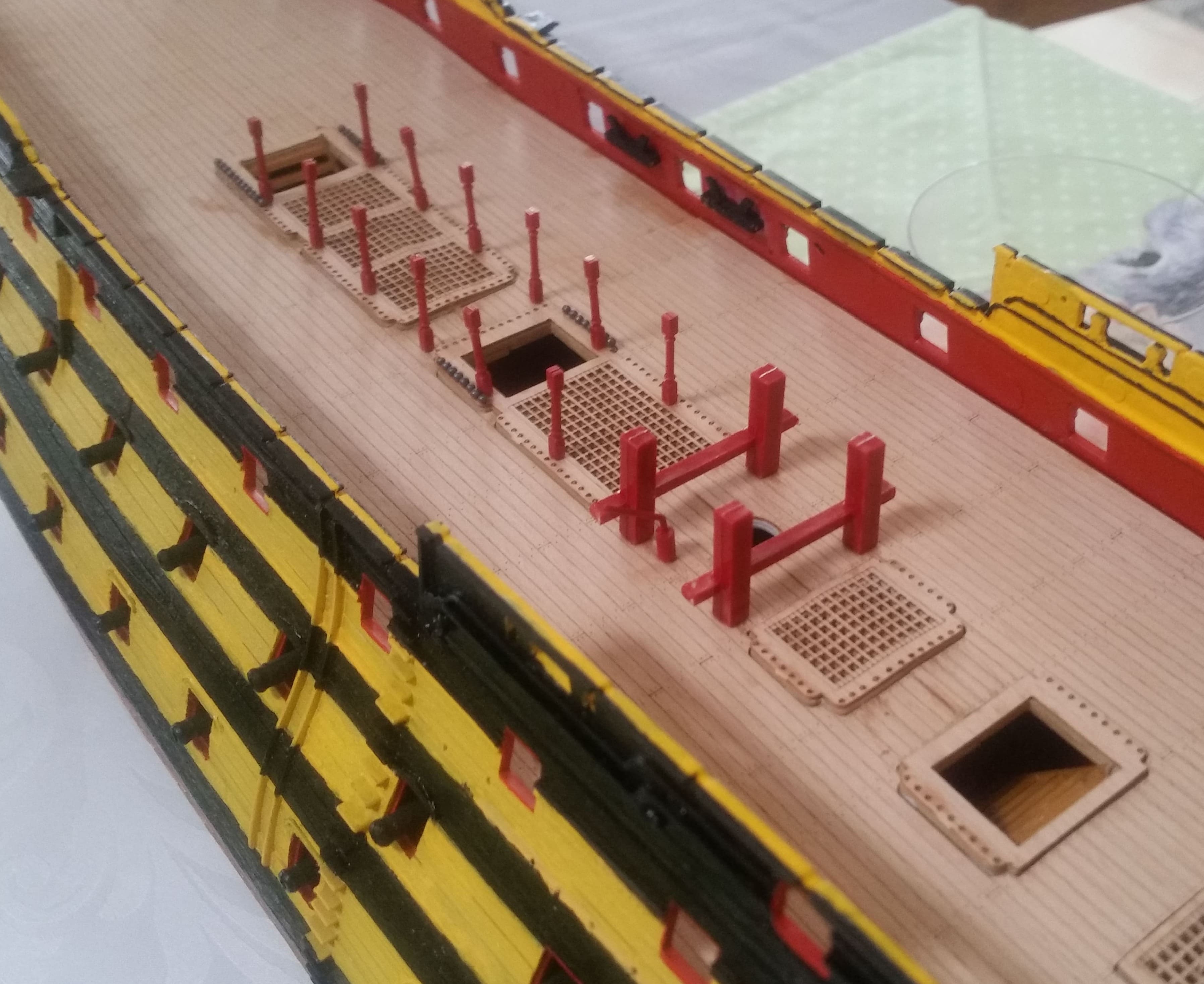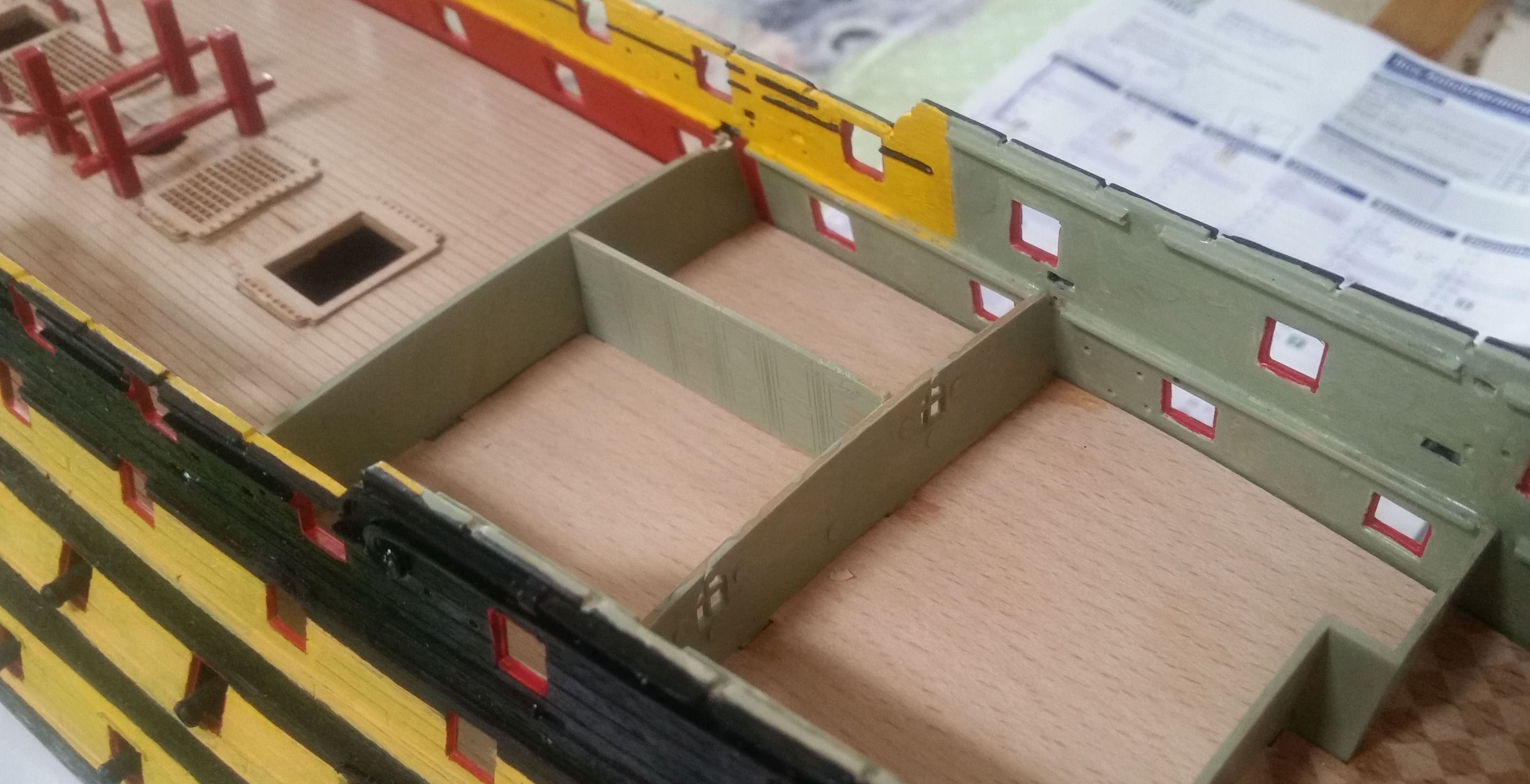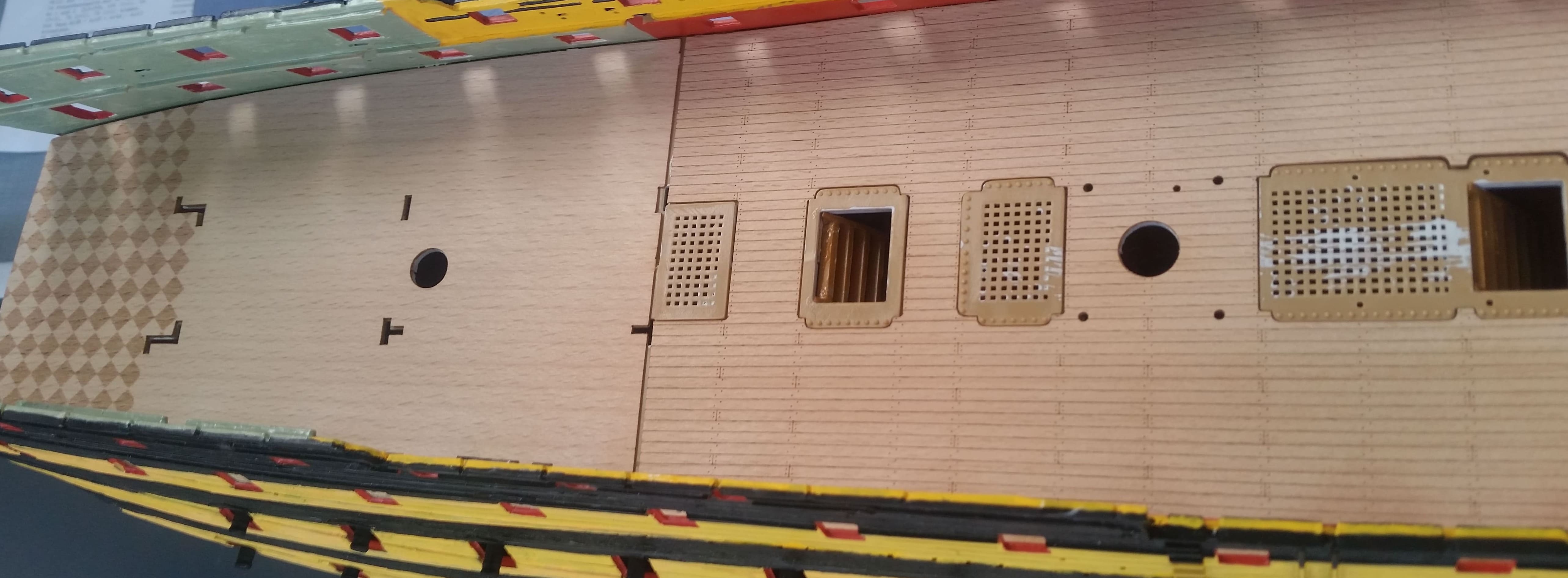 Danke für den Tip Dafi. Ich habe das Oberdeck vom Kuhl aus Richtung Bug hineingeschoben und das klappte gut. Am Heck konnte ich es einfach einklicken. Beim Einschieben sind dann zwar sämtliche Träger auf dem Mitteldeck abgebrochen aber das war einfach zu beheben. Mehr Schwierigkeiten hatte ich beim Aufkleben des Holzdecks. Da musste ich am Rand ein wenig wegschneiden. Als nächstes wird das Schott für das Gallion bemalt. Gruß Ingo