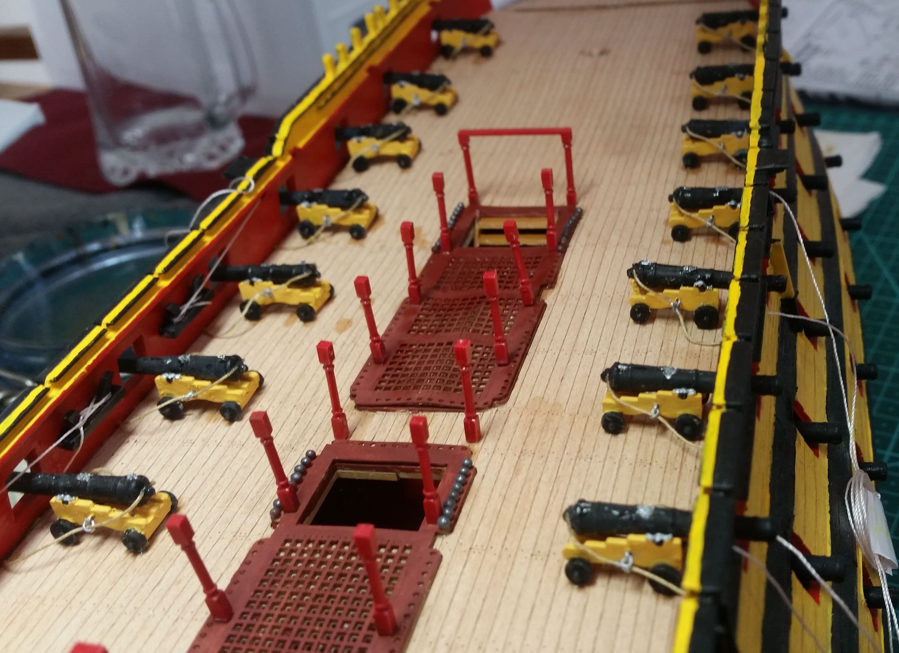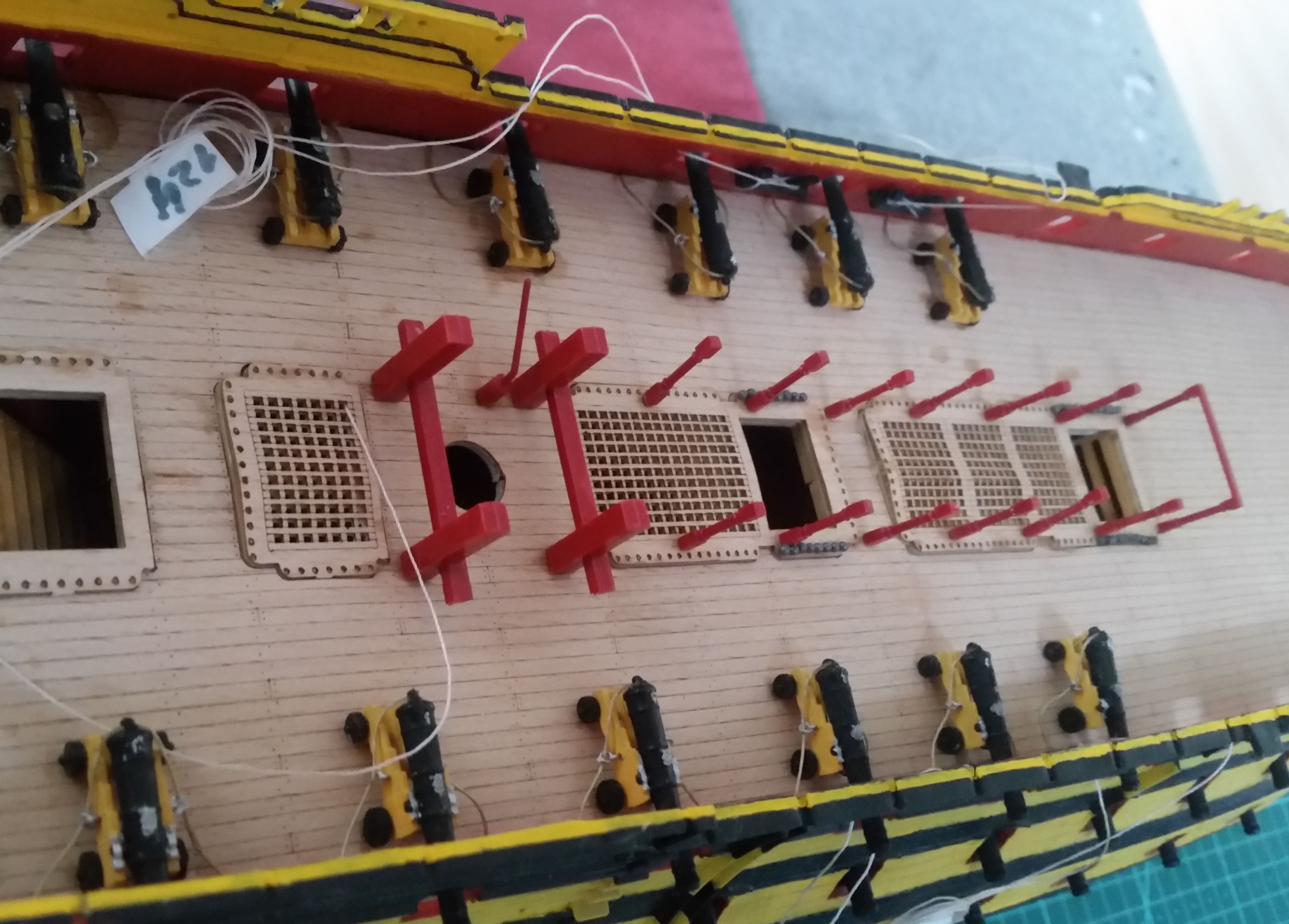 Die ersten Taue sind angebracht. Auch die ersten kleineren Geschütze sind aufgefahren. Es ist sehr mühselig beim Zusammenbau dieser Kanonen.