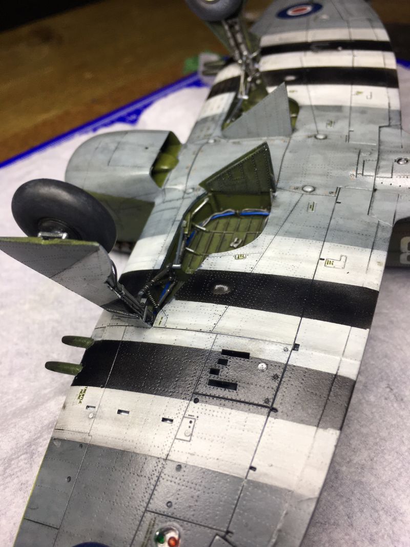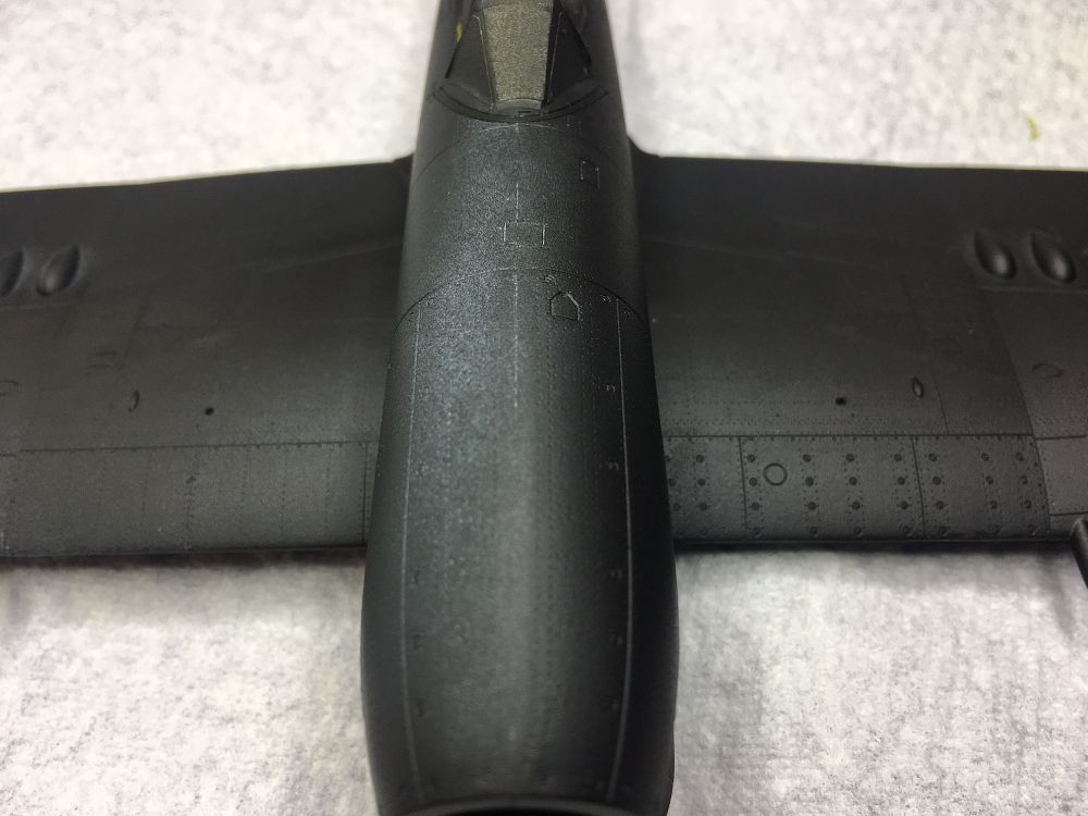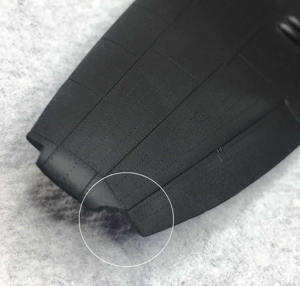 Das auf der einen Flügelunterseite etwas Weiß unters Tape gelaufen ist macht nichts. Nach dem anstehenden Ölwashing hat sich das erledigt.