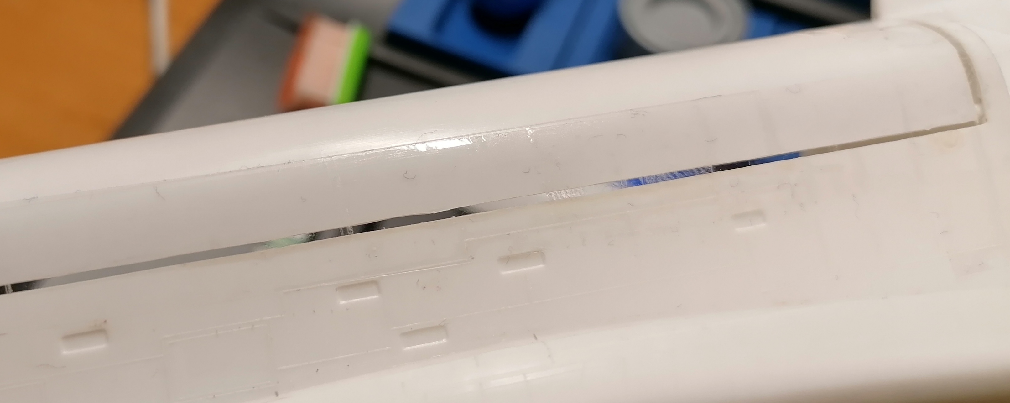 Bei meinem Shuttle hatten die Ladeluken an dieder Stelle ganz gut gepasst. Nur zum Cockpit und Heck hin, war da nichts parallel. Da feilte ich mit der groben Feile rechwinklige Kanten und füllte die Lücke mit Kunststoffstreifen auf.
