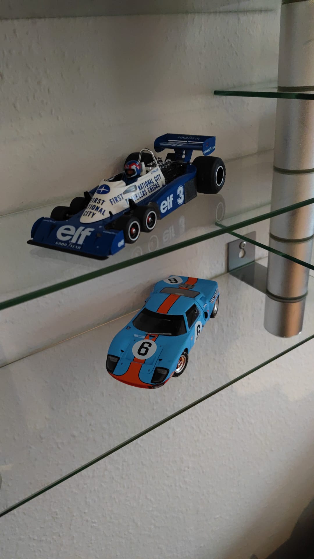 In Regal teilen sich noch CD's den Platz mit den Modellen. Mit jedem neuen fertigen Modell müssen dann die CD's weichen.... Bis jetzt sind es fünf, die Ente, die Cobra, Corvette, Ford GT und jetzt der Tyrell. 7 weitere können da rein... 😜😜😜