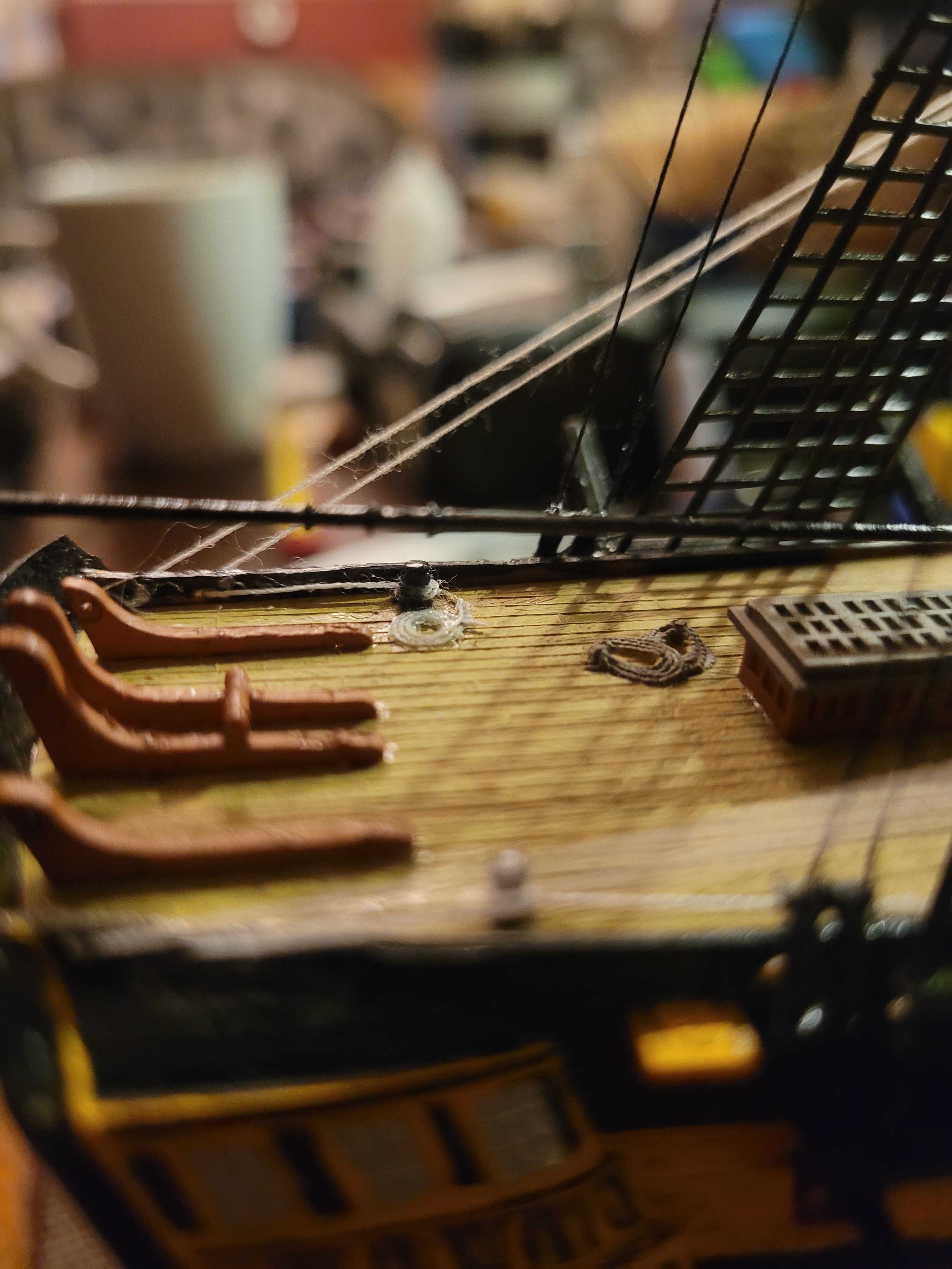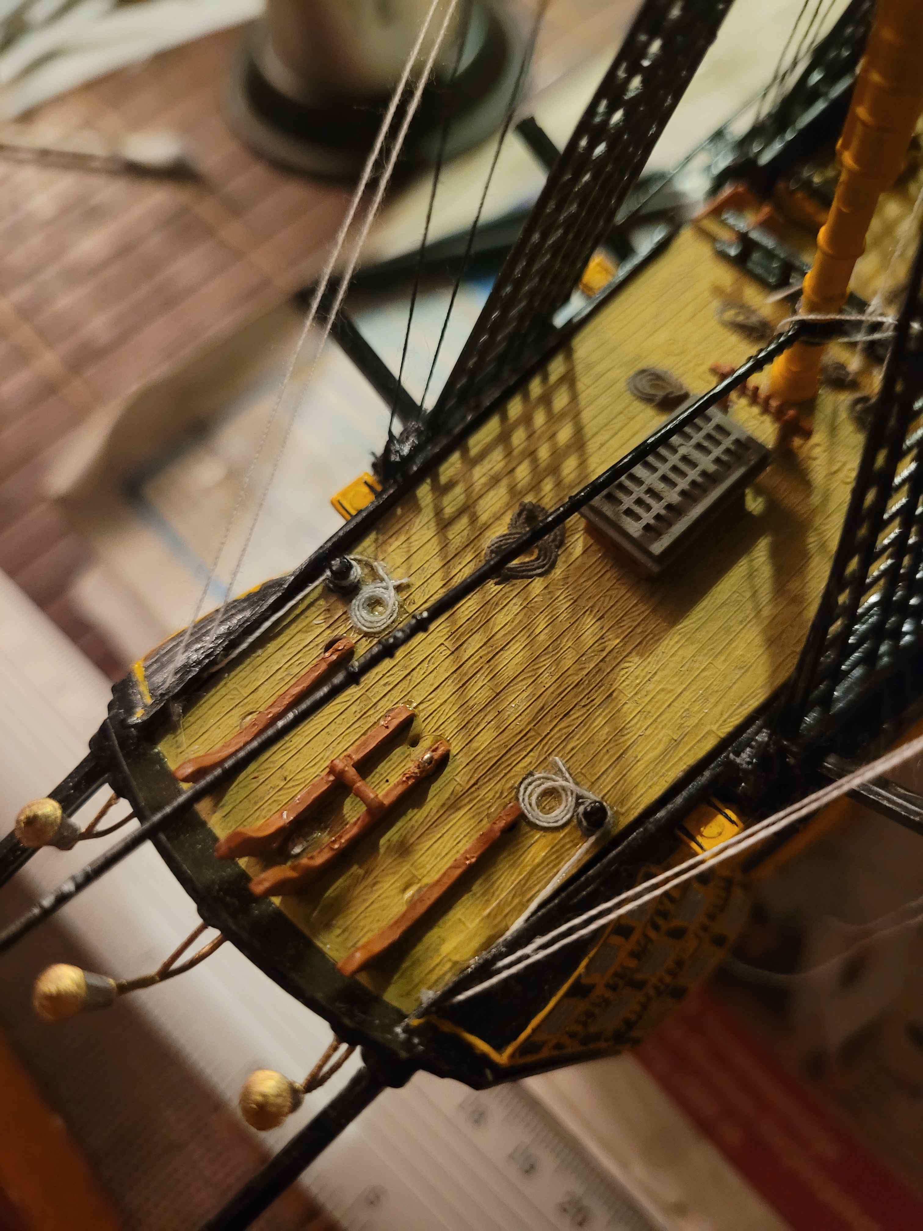 Das Poopdeck der Vic wirkte irgendwie bisschen...mhmm...leer, kaum Möglichkeiten, die Takelage einigermaßen detailgetreu nachzubilden. Die Brassen soll man laut Anleitung an die hinteren Ausleger knoten usw. Nix da!