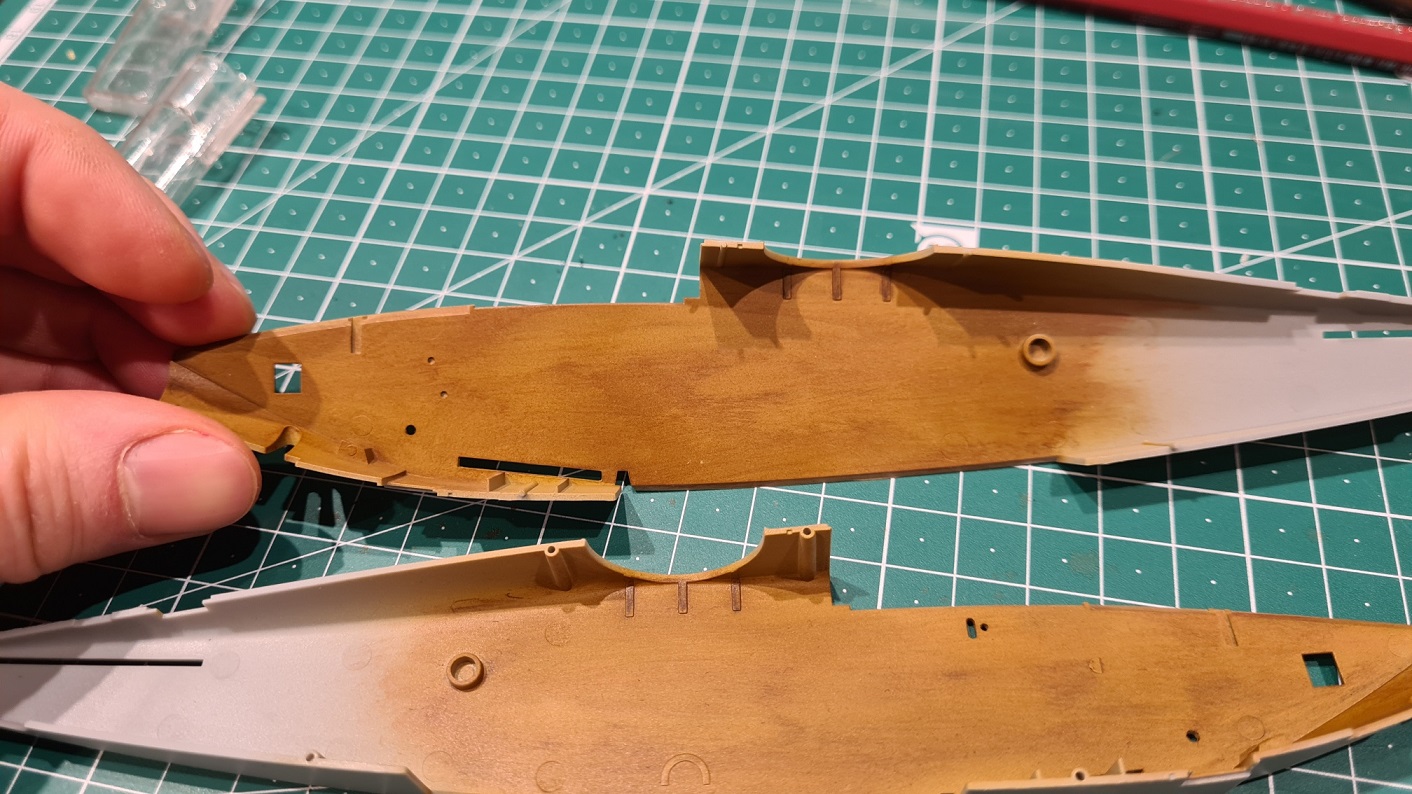 Das Vorgehen habe ich ja schon ein paar Mal erklärt. Mit einem hellen Braunton (hier TamiyaDeck Tan XF-55) satt vorlackieren. Ganz wichtig, für den nächsten Schritt muss die Farbe richtig durchgetrocknet sein. Bei mir lagen die "Werkstücke" 24h auf einer warmen Heizung.