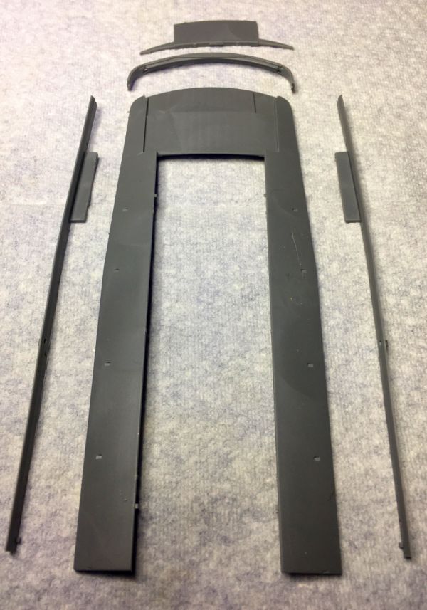 Los ging es mit den beiden Enden der Bahn. Die, wie üblich, vielen Einzelteile passten gut ineinander und wurden gleich mit der Airbrush bearbeitet. Dann kamen die Klarteile, Haltestangen und Scheibenwischer (mit Handbetrieb) hinzu.