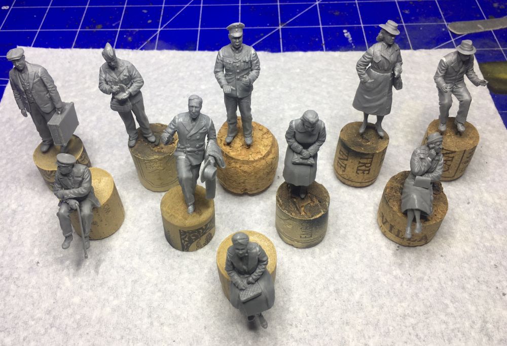 Zwischenzeitlich habe ich dann auch schon die 8 Figuren zusammenbebastelt, aufgespießt und grundiert.