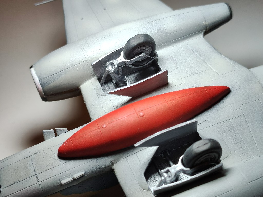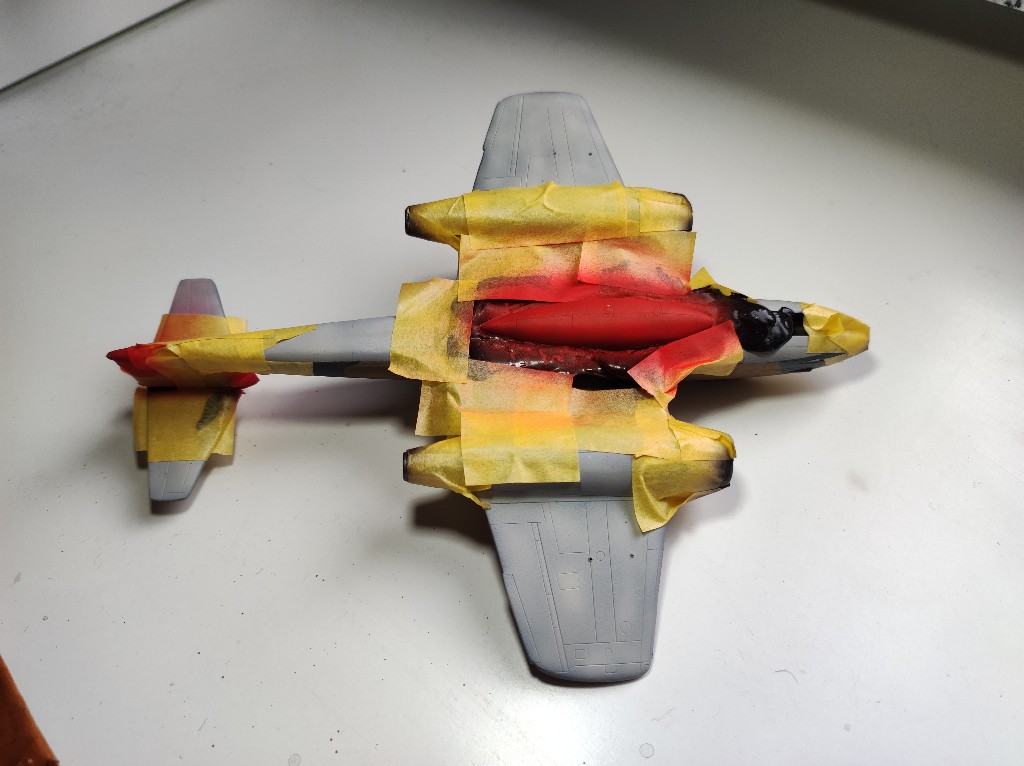 Damit wir aus der Meteor auch das gewünschte Zielflugzeug machen, musste einige Stellen mit einer signalroten Farbe besprüht werden. Außerdem fehlten noch die Schwarz-weißen stellen am Triebwerk und ein ansprechender Triebwerksauslass.