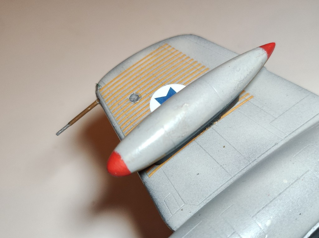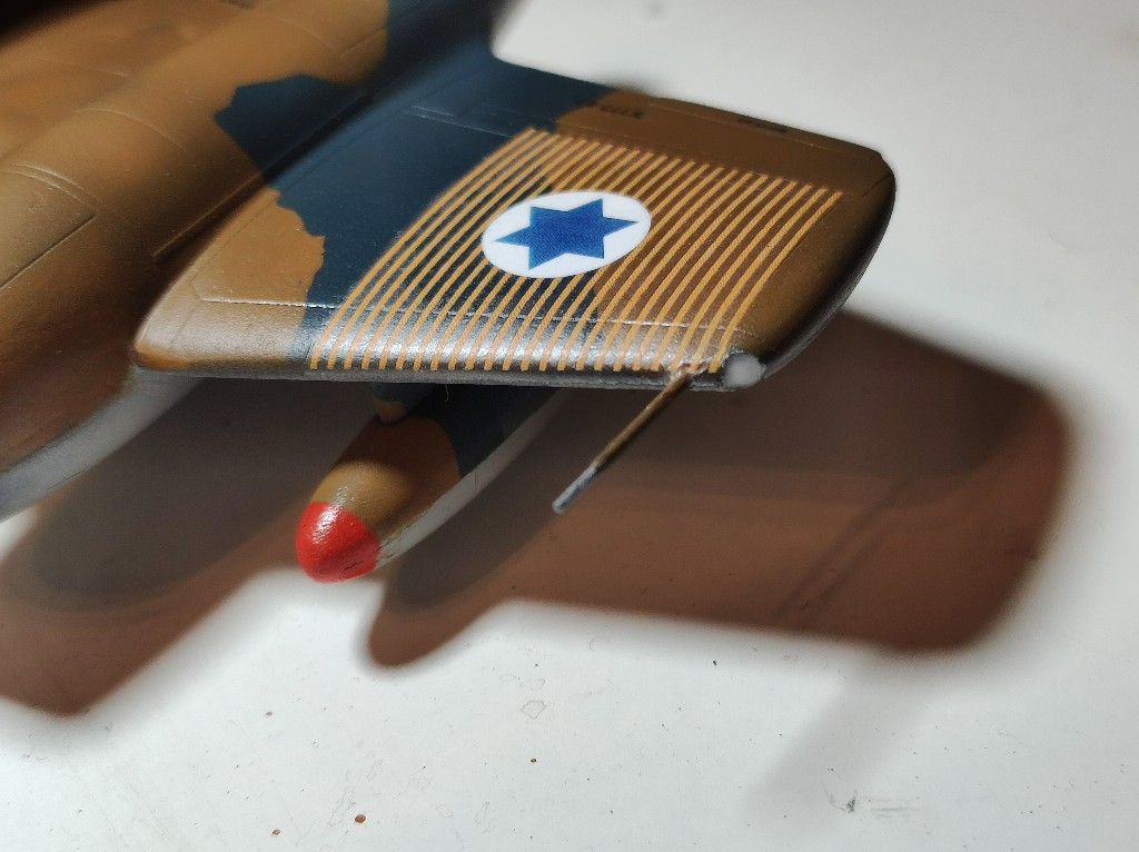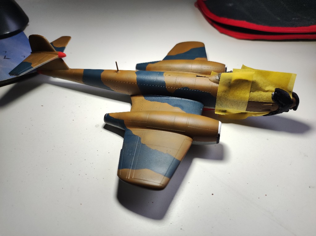 Dann war ich fertig... Dachte ich und entfernte alle Masken, ein Blick in die Anleitung zeigte aber, dass ich ganz entscheidend was vergessen habe: die schwarzen Bereiche um die Maschinenkanonen in der Nase fehlten noch