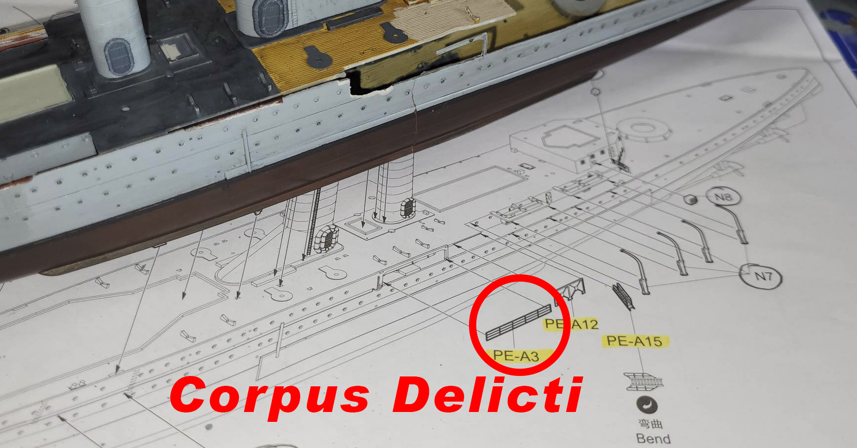Mir ist beim Bau des Modells am vergangenen Freitag leider die Sicherung durchgegangen, was zur Folge hatte, dass das Modell den Bach runterging. Oder anders ausgedrückt: Ich bin in einem Zustand völliger Genervtheit an den Einbau eines Fotoätzteils gegangen – und es ist fürchterlich schief gegangen.