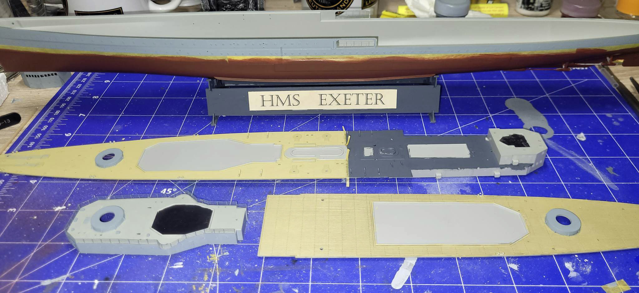 Die neue Exeter wurde also auf Kiel gelegt und der Rumpf angefangen zu bemalen, Ebenso die beiden großen Oberdecks, die in den nächsten Tagen noch miteinander verklebt werden, bevor sie an ihren Platz im Rumpf geklebt werden. Weder Rumpf noch Oberdecks sind soweit fertig, es fehlt noch etwas Farbe.