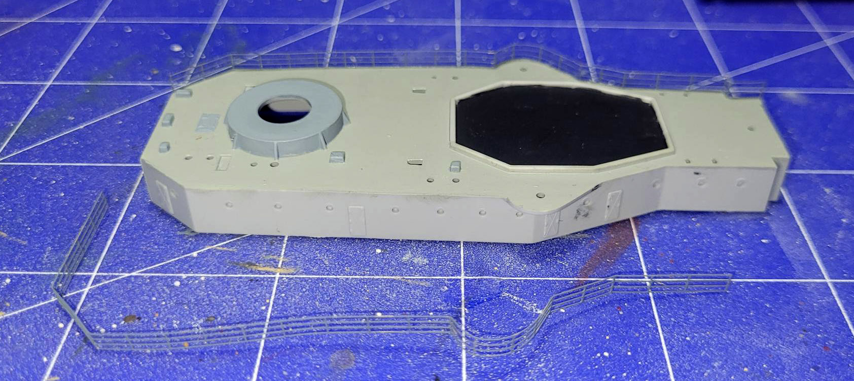 Als Versuchsobjekte habe ich zwei Teile aus dem Ätzteilsatz der alten Exeter benutzt, ebenso ein Deck aus selbigem Bausatz. Beide Ätzteile habe ich jetzt mal mit Leim angebracht, mal gucken wie das läuft.
