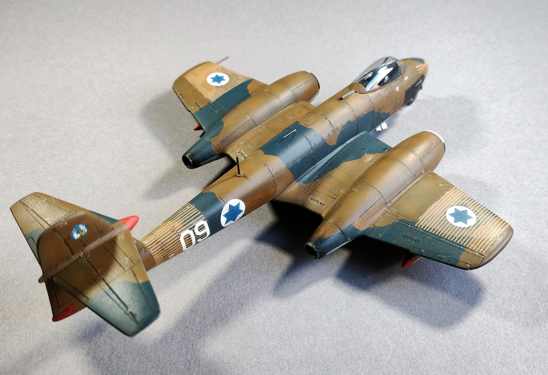 Heute kann ich euch das Ergebnis meines letzten Projekts präsentieren. Es handelt sich umd die Gloster Meteor Mk. 8 unter dem Davidstern, wie sie noch Anfang der 60er Jahre als Zielflugzeug verwendet wurde. Bereits im Koreakrieg hatte man feststellen müssen, dass der britische Düsenjäger erster Stunde den neuen Sowjetischen MiGs hoffnungslos unterlegen waren. Im zweiten Konflikt, wo dieses Flugzeug mitwirkte, wurde das Muster auf beiden Seiten, also der Arabischen und der Israelischen, verwendet.