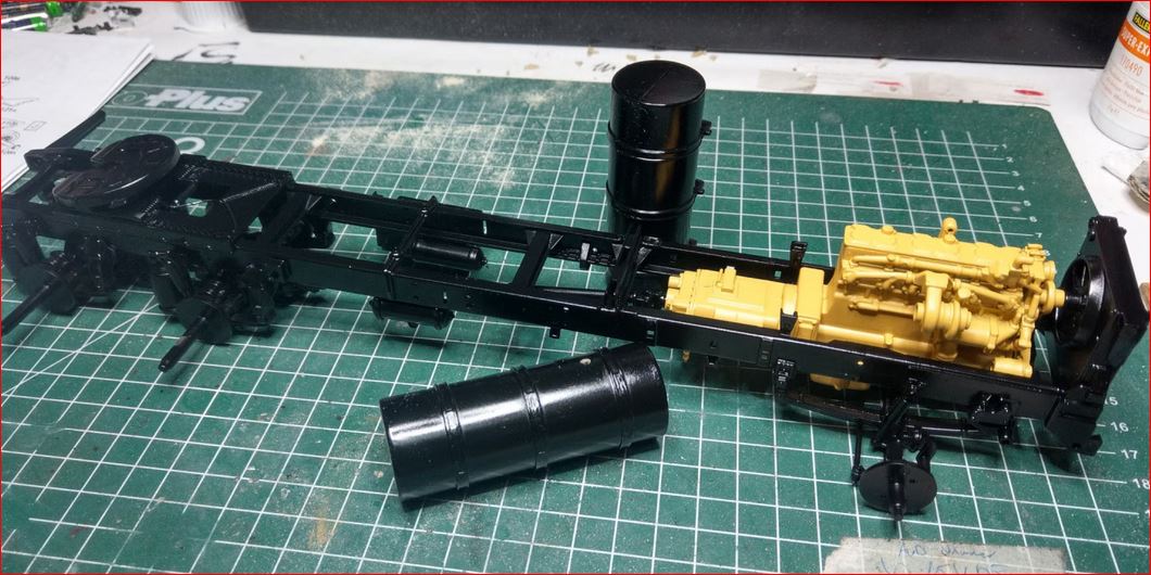 Bei meinem Truck habe ich zumindest das Fahrgestell für mich soweit abgeschlossen. Ohne viel drum herum: grundiert und schwarz gemacht. Auch die Tanks.