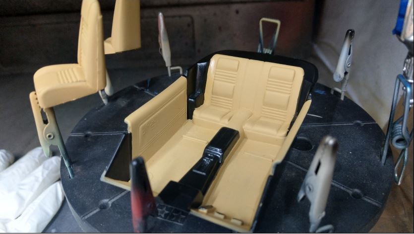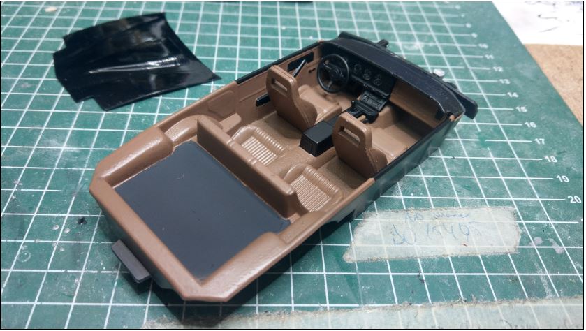 Ein zweites Modell (1977 Trans Am von Monogram) verlor eine Rückleuchte. Herstellerbedingt wird die von innen verbaut. Super. Vom Chassis konnte ich den Kleber lösen und dann fiel er mit nur wenig Hilfe fast komplett auseinander. Also entschloss ich spontan den ebenfalls zu restaurieren. Dem spendierte ich dann gestern eine frische Schicht Klarlack. Schwarz mit schwarz an einem "Bandit"-Trans Am mag ja hip sein aber auch trist. Also da ich ihn schonmal auseinander hatte frischte ich die Innenausstattung ebenfalls auf.