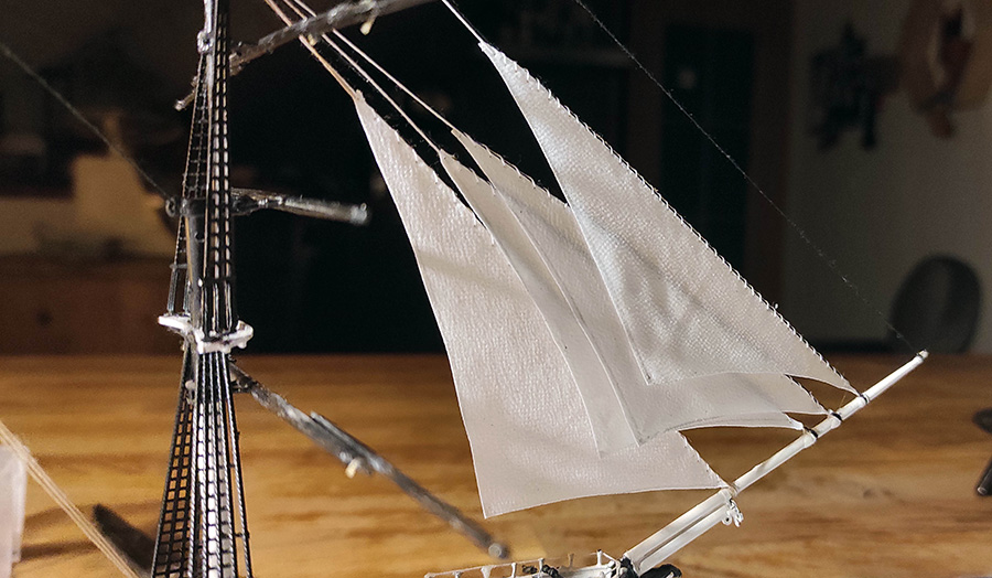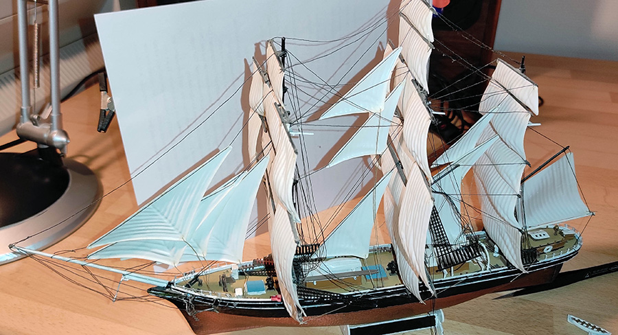 Das starke Garn betont die Präsenz der Seilzüge und lässt die Rahen stramm vertaut wirken.